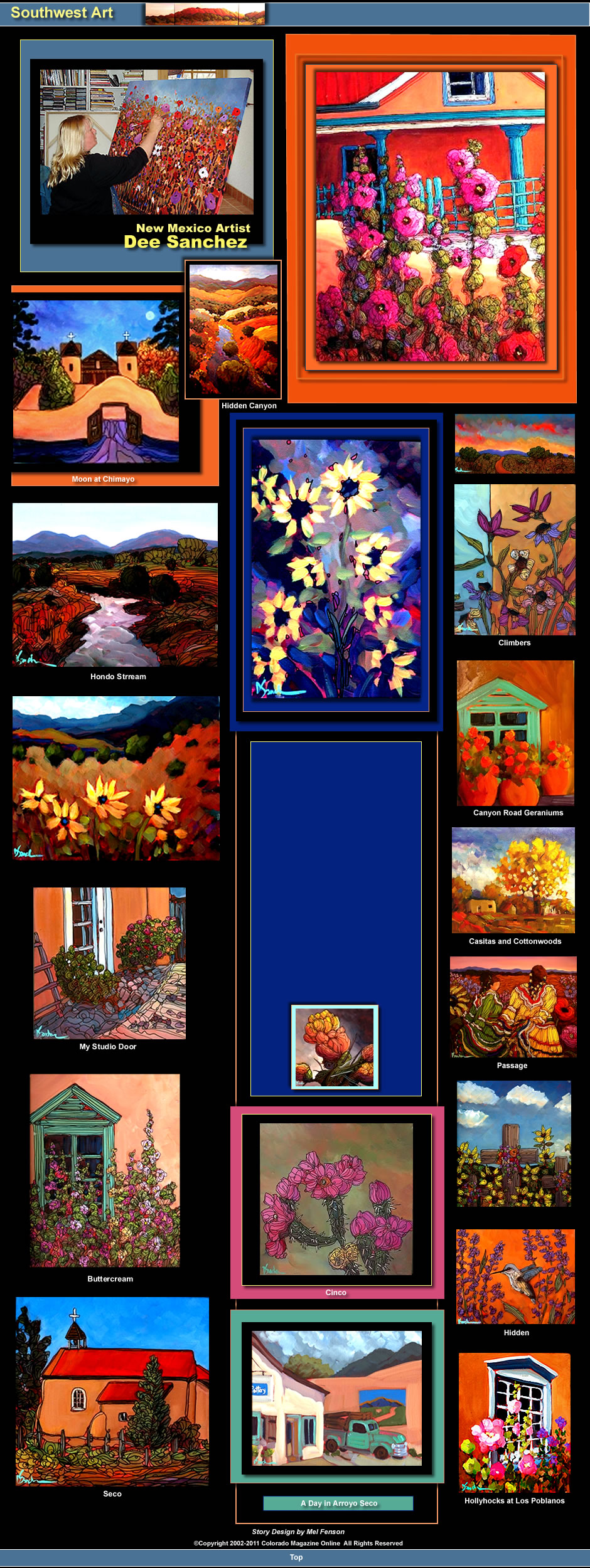 Self-taught, Dee has become known for her vibrant paintings, which range in subject matter from representations of wildflower meadows to urban landscapes to impressions of quaint New Mexico villages to cheerful images of sunflowers.