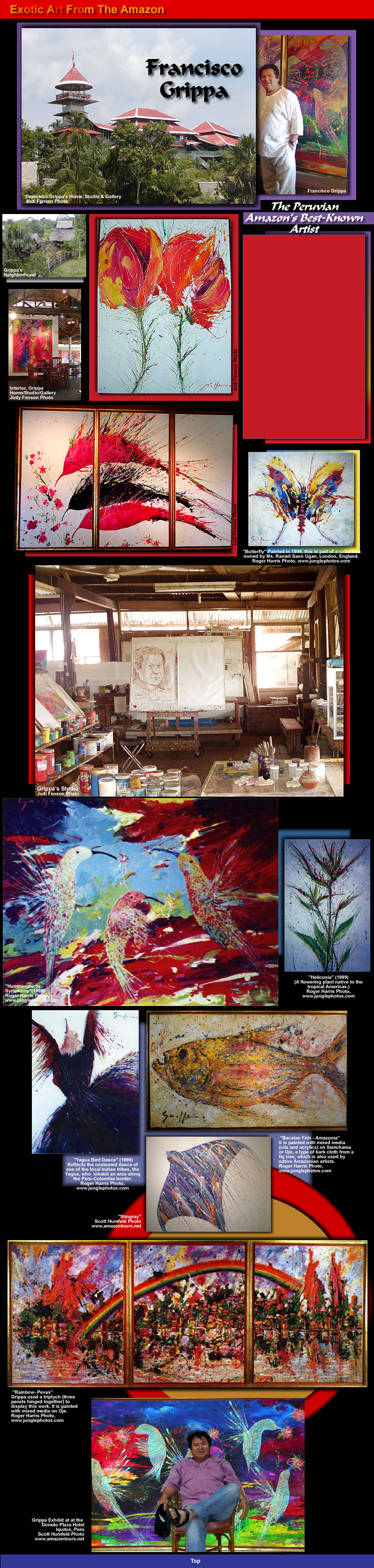 works from his spacious native-built home, which sits A native of Peru, born of Peruvian and Hungarian parents, Grippa studied art in Paris, London and New York. He exhibits in the United States. His painting technique employs the use of both canvas and Oje, which is a native cloth made from the bark from a fig tree. He works with both oils and acrylics. Grippa's work represents a unique impressionistic interpretation of the forms and colors of jungle vegetation and rainforest inhabitants. It also relects the influence of Jackson Pollock, the American abstract painter who was famous for splattering his canvasses with paint, as well as that of the French impressionists. Francisco graciously welcomes visitors to his studio/gallery, where they can chat with him, view his work and purchase his paintings, which range in price from $250 to over $5,000. For Amazon Travel