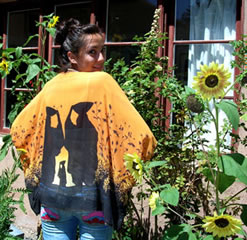 Jonathan’s images are also now being used in the fashion world. Zandi Designs, a designer of original and exotic fashions in Talpa, New Mexico, used Jonathan’s painting, “The Sun Rise,” as a graphic image on one of its washable silk float coats and used his daughter, Carly, to model it for the company’s website catalog. http://www.zandidesigns.com/line.html#5