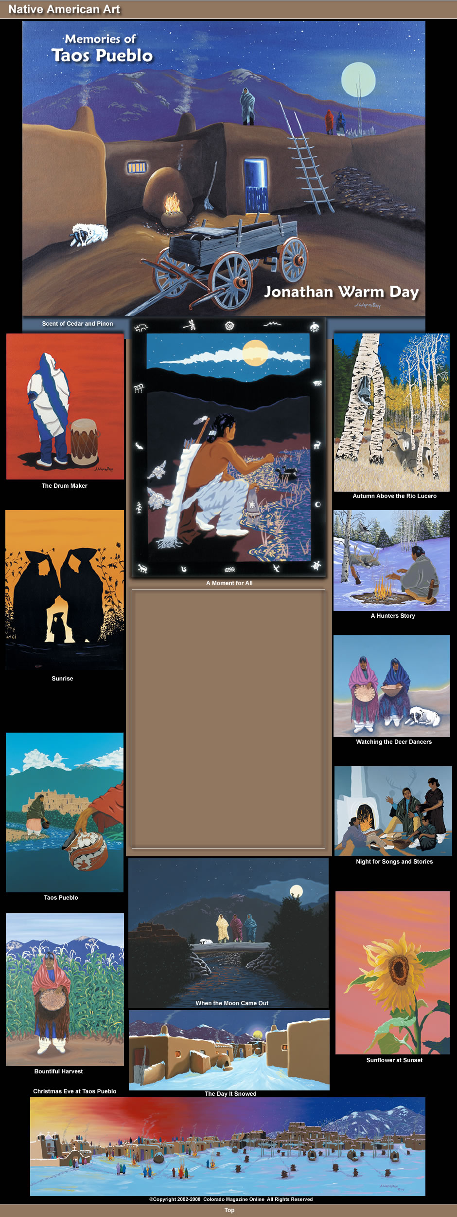 Renowned Taos Pueblo artist, storyteller and writer, 56 year-old, Jonathan Warm Day is known for his colorful acrylic paintings, which provide a visual narrative of the daily experiences and spiritual life drawn from his many childhood memories at the Taos Pueblo in New Mexico. His earthy paintings illustrate the graceful and enduring lifestyle of the Taos Pueblo people and their respect for nature.