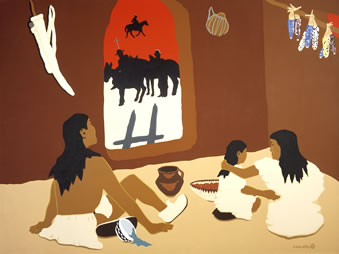 The painting was purchased by the Millicent Rogers Museum in Taos for its permanent collection. Shortly thereafter, Joseph H. Suina, an associate professor in the College of Education at the University of New Mexico from Cochiti Pueblo, wrote an essay about the event, which appeared in the January 1992 issue of New Mexico Magazine. Jonathan’s image accompanied the story. Turner Publishing Company also asked to use the image in a large coffee table book called, “The Native Americans,” and for an accompanying calendar. The painting has also been featured in a college history textbook, “First Peoples, A documentary survey of American Indian History,” by Colin G. Calloway, a professor of Native American Studies at Dartmouth College. It was also used in a grade school history book titled, “Perspectives, Authentic Voices of Native Americans,” published by Curriculum Associates.