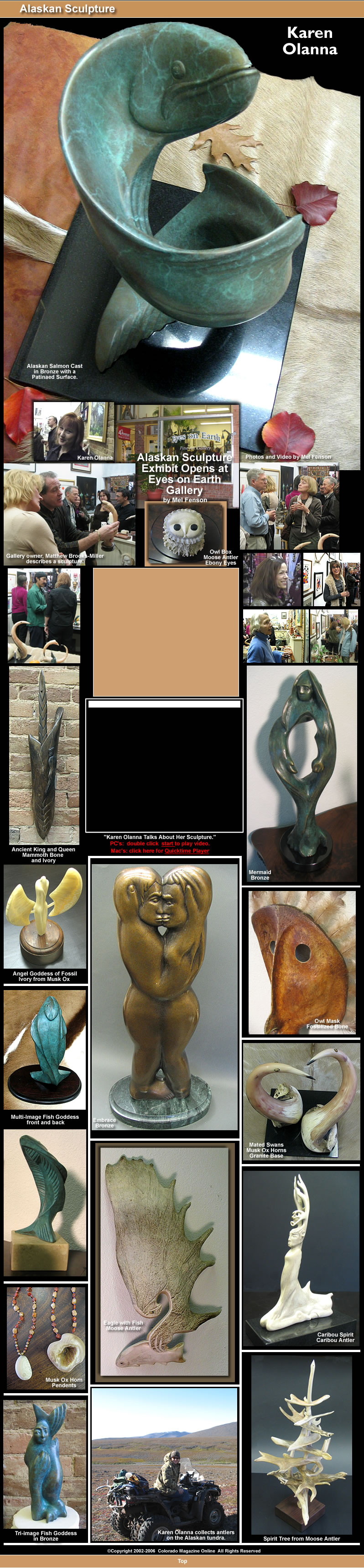 Karen said she uses tools such as a band saw and a rotary grinder to carve her sculptures, plus very fine files and, “ lots of sand paper. “ She said she likes the rich colors found in antlers and other natural animal materials she works with and finds their shapes fascinating. She trys to retain much of the natural shapes in many of her pieces. She also incorporates inlaid accents of fossilized mammoth ivory in some pieces. She explained that the process of sculpturing a piece requires working it over and over to shape and blend the forms. She said she sometimes works on a piece over time, “...coming back again and again to work on it.” She added, “You can’t change just one detail, when you are reworking a carving - you have keep working around and around so that the forms flow one into another.” She also cast bronze sculptures, working from plaster molds. Many of Karen’s sculptures incorporate multiple animal and human images which blend together around a piece.