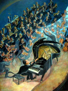 New Mexico artist Richard Knadle, a native of Roswell, recalls that he learned to paint when he was young by copying the work and techniques of old European masters. Among those painters were Sir Peter Paul Rueben, a seventeenth-century Flemish Baroque painter, whose paintings emphasized movement, color, and sensuality, and William Turner, a famous English romantic landscape artist. Richard’s work was so good that it caught the attention of a Christie’s fine art auction house representative, who discovered some of his early paintings in an antique shop, when he happened to be passing through Roswell in the mid-80's, 30 years after they had been painted. He purchased all of them for resale in a gallery where Christie’s sells reproductions. Explaining his work method, Richard said he starts with watercolor reference sketches for his New Mexico landscapes and supplements those with reference photographs. He then translates those sketches into full-scale paintings. His colorful studies of cowboy paraphernalia are done from studio displays. He also creates sculptures in bronze. Richard noted that his painting has been influenced by the works of Georgia O'Keefe and Peter Hurd, who was a personal friend of his, and many other painters. He has also been influenced by Salvador Dali’s realist paintings, as illustrated in his painting of a symphony orchestra, shown below.