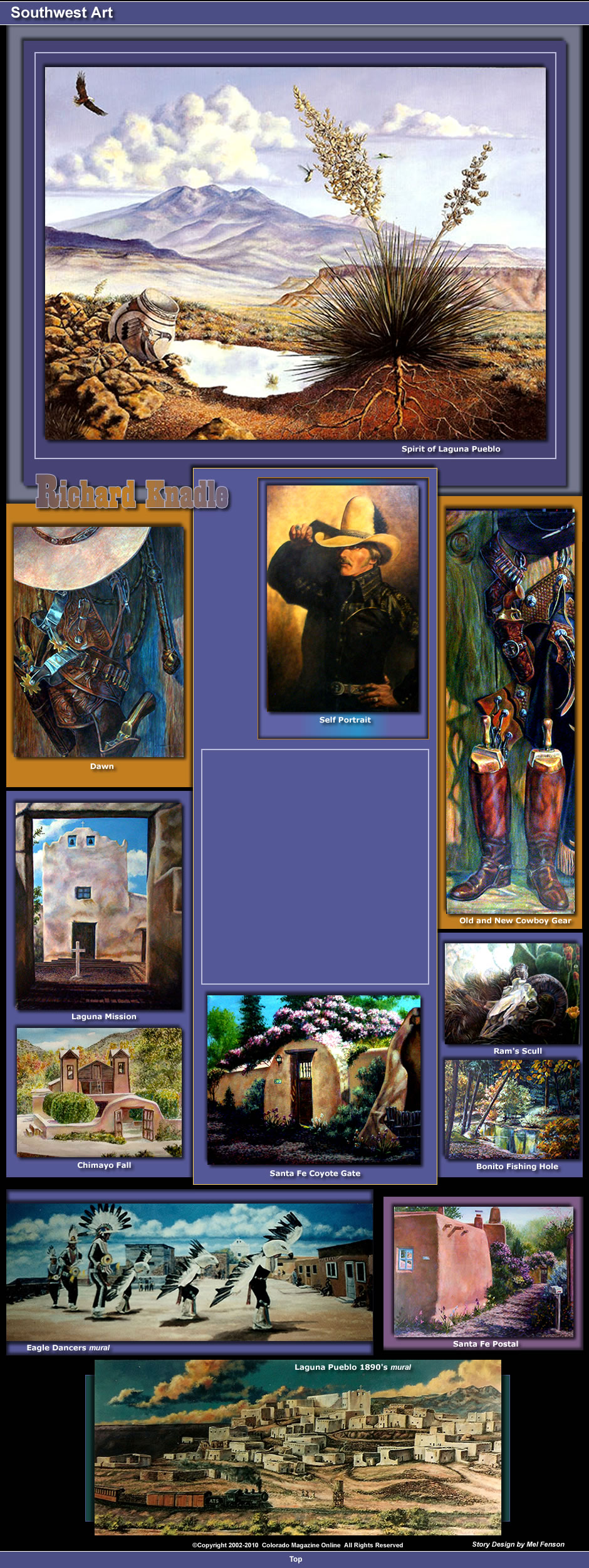 Although he previously worked in oil, he now works primarily in watercolor and acrylics. He explained that he only uses red, blue and yellow, which he mixes to create the colors he wants to work with, plus white. He added that he sometimes paints as many as seven layers, which he thins down to appear as transparent. Richard’s paintings range in size from 16 x 20 inches, up to 4ft. x 4ft. Richard was graduated from Roswell High School in 1960, then attended the University of Colorado. He was graduated in 1964 with a BS degree in marketing and a minor in art, which was focused on bronze sculpture. After college, he went into the army through the army reserves. When he finished active duty, he went to work as an assistant film editor, writer and graphic artist in the news department of a CBS television affiliate in Los Angeles. He noted that his responsibilities also included greeting celebrities, such as Gloria Swanson, Ronald Reagan and Carol Burnett, who came to the studio for interviews. During his time at CBS, he also attended Otis Art Institute in Los Angeles, where he received additional training in commercial and graphic art. After seven years with CBS, Richard returned home to Roswell to buy out and manage his family's retail dress shop, when his father retired. In 1986 he left the retail business and became a freelance commercial artist in Albuquerque, New Mexico. He enrolled in graduate school at the University of New Mexico there in 1989, where he received certification to teach K-12 art in public schools. After he received his teaching certificate, Richard taught art for five years at a new middle school, established at the Laguna Pueblo, 40 miles west of Albuquerque. While teaching there, he was commissioned to paint several large murals on the walls of the Laguna Middlle School, which illustrated the history of the Pueblo. After five years at the Laguna pueblo, Richard returned to Roswell to teach art at Roswell High School, where he retired after 11 years. While he was there, he also taught art as an adjunct teacher at Eastern New Mexico University in Roswell. His