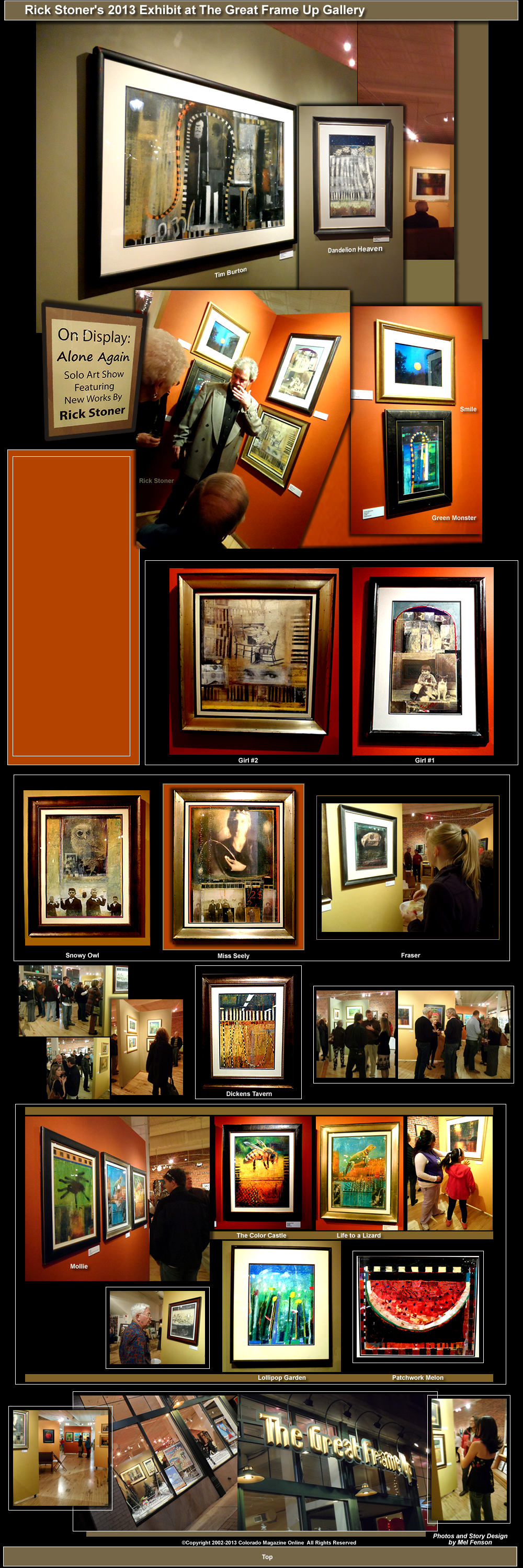 Mel Fenson Rick Stoner’s exhibit, held at The Great Frame Up gallery in Longmont, Colorado, showcased his current works - that revealed a daring new style. This series incorporates intriquing abstract designs - rich in color - that are integrated with collages of prints taken from an old family photo album. These paintings - rendered in gouache and mixed media - demonstrated the evolving depth of Rick’s impressive artistic abilities. His previous work, focused on still life paintings done in pastels and oils. This series incorporates historical photographs of members of the Stoner family on his Dad’s side. The images, many of which were photographed in the early 1900s by his uncle, John Stoner - according to his grandfather - were taken from an old family photo album given to Rick by his grandfather. Rick said, “He gave me as much information as he could in terms of the people he recognized.” The album had been in Rick’s possession for a long time, but until recently, he had not paid much attention to it. When he started looking at it, he realized that, “there were some wonderful photographs in there and that they represented a precious family legacy.” Rick’s great-great grandmother and great-great grandfather are both pictured in the album, along with his great grandfather and great grandmother, and his grandfather. They were all Stoners. Rick decided to use some of the photographs as subjects in a series of new paintings - “as a way of reconnecting with my long deceased family members.” In his paintings, titled “Girl# 1” and “Girl #2” - a girl is pictured, who Rick believes was his uncle’s daughter and therefore a distant cousin of his. The photographs were probably taken the early 1900’s by his uncle, John Stoner. They are a part of a series of photos that were taken on the girl’s front porch, which Rick thinks was in Kansas. In the painting “Girl #2” that pictures the girl playing the piano, Rick said he redrew the eyes and added a guitar and a keyboard motif. In the photo used in the “Miss Seely” painting, the woman seems to be holding what may be a wand. Playing with her curious appearance, Rick painted some orbs to add to the mysticism. Other objects in the painting, such as the numbers and dollar sign refer to various personal issues Rick has encountered in his own life. The “Snowy Owl” painting shows two boys holding a stick between them with an owl sitting on it. Rick painted a large image of an owl at the top. The boy with the dark hair on the center left is Rick’s grandfather, Earl Stoner, who was born in the late 1800s. The Tim Burton painting was named that, after, someone said that it reminded him of a Tim Burton produced movie - because of Burton’s bizarre films, such as Beetlejuice and Edward Scissorhands. “However,” Rick said, “The painting is actually about the music that was going through my mind, when I painted it. As I was working on this painting, different images just started popping up in the paintings as they have in other paintings I have done.” “The mystic and ghostly qualities portrayed in this series of paintings were not all planned. Various shapes, images, figures and faces just seemed to happen and appear unexpectedly as I painted,” Rick commented. In the “Dandelion Heaven” painting, the image was painted twice with a smaller version at the bottom. There is an unknown girl from the photo album that appears three times in this painting, along with various other family members - including his great grandfather, great grandmother, and other unknown relatives - who Rick could not identify. These people are clusted in photos at bottom of the painting. The middle part of the drawing was done in charcoal with tracing paper placed over part of the drawing. Rick noted. “It just turned out to be tree-like or bone-like - I don’t really know what happened with it.” As he painted it, he thought about the old folk song “Where Have All the Flowers Gone” and the idea of a grave yard came into his mind, Rick explained, “with the fence of the grave yard and the roots of the trees in vertical white areas. The flowers came from the song. The top part of the scene with a dark blue sky and stars represents heaven.” Some people at the exhibit’s opening thought the painting represented his family roots. Rick used an acrylic gel medium to attach all the elements in the painting. It is protected with glass. In “The Dickens Tavern” painting, Rick used stripes, which he likes because they remind him of the stripes he has seen in old photos of baseball players wearing stripped uniforms. Jennifer Engle, who provided Rick with conceptual suggestions, while he was working on the series - and set up the Exhibit at The Great Frame-Up - said this painting reminded her of the Dickens Tavern because the stripes resembled the awning in the front of the building - and that’s where the name originated. Rick said he turned the original painting upside down, to finish working it. The spider, named “Mollie” was painted from an image in a book. The bottom was done with an airbrush. The two dark structures represent the World Trade Center’s twin towers. Inspired by various things and happenings in his life, “Life to a Lizard” - a painting of a beautiful foot-long collared lizard was like one he encountered when he was young and on a rafting trip down the San Juan River in Cortez. He had thrown a rock to make it move, but missed and accidently killed the lizard. It had always bothered him that he had killed it. He said he painted its picture because, “Maybe I owed that lizard a life.” “The Color Castle” - a painting of a Bee was an experiment with color. The colors and pattern in bottom part were inspired by richly colored fabric patterns designed by Eves Saint Larent that Rick saw at a fashion show in Denver. Rick had all the old photographs he used reproduced at a print shop, then he cropped 