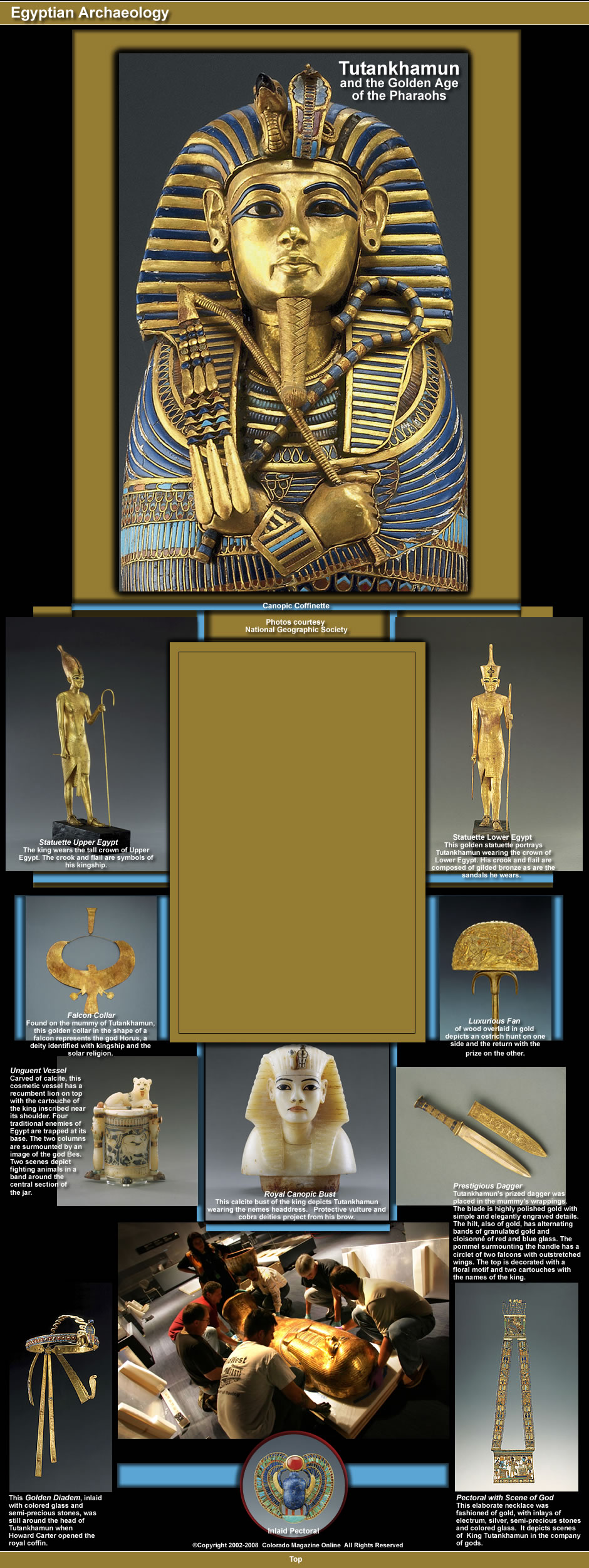 The following information, as described on the www.kingtut.org website, sheds light on King Tutankhamun’s life. It was adapted from text written by Dr. David P. Silverman, National Curator for "Tutankhamun and the Golden Age of the Pharaohs," and Dr. Zahi Hasass' book "Tutankhamun and the Golden Age of the Pharaohs." Dr. Zahi Hasass is Secretary General of Egypt’s Supreme Council of Antiquities and a National Geographic Explorer-in-Residence.