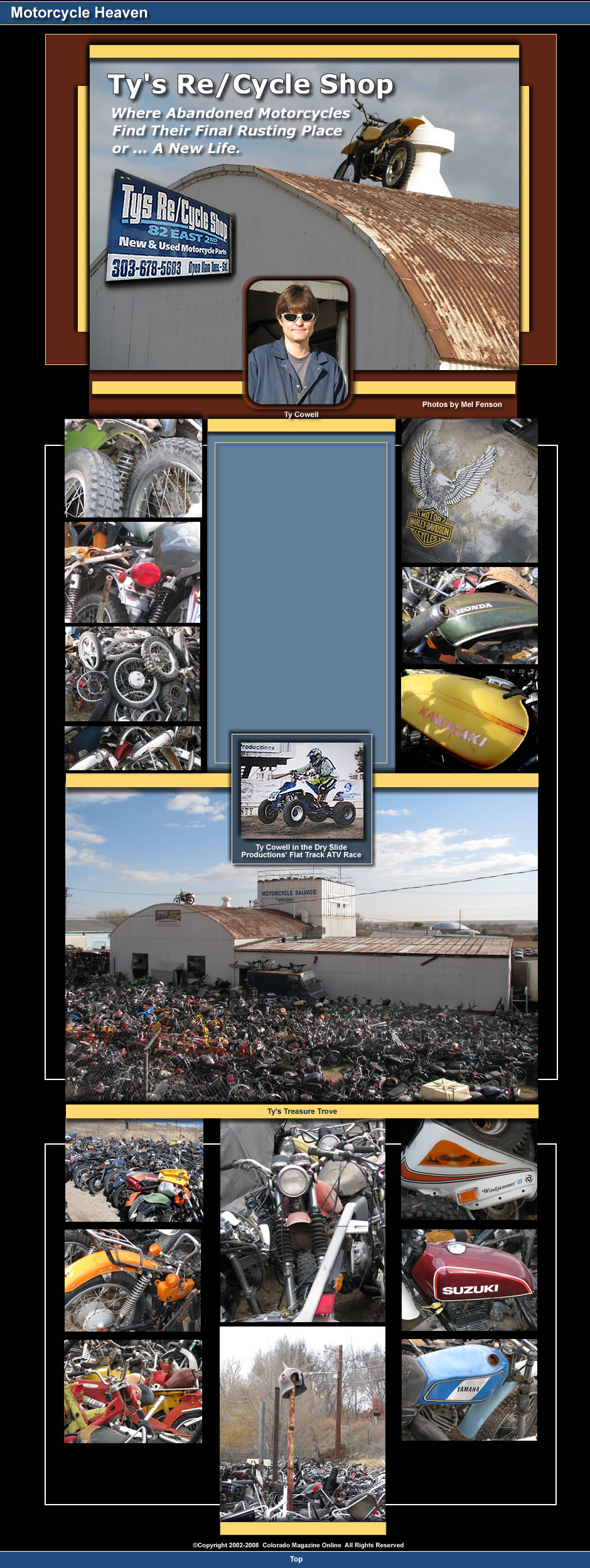 This rusting rubble empire, located in Longmont, Colorado, is the playground of thirty-nine year old Ty Cowell, who has been operating his Motorcycle Salvage yard and repair shop since 1992. Formerly called Ty’s Repair Shop, it has now been renamed Ty’s Re/Cycle Shop.