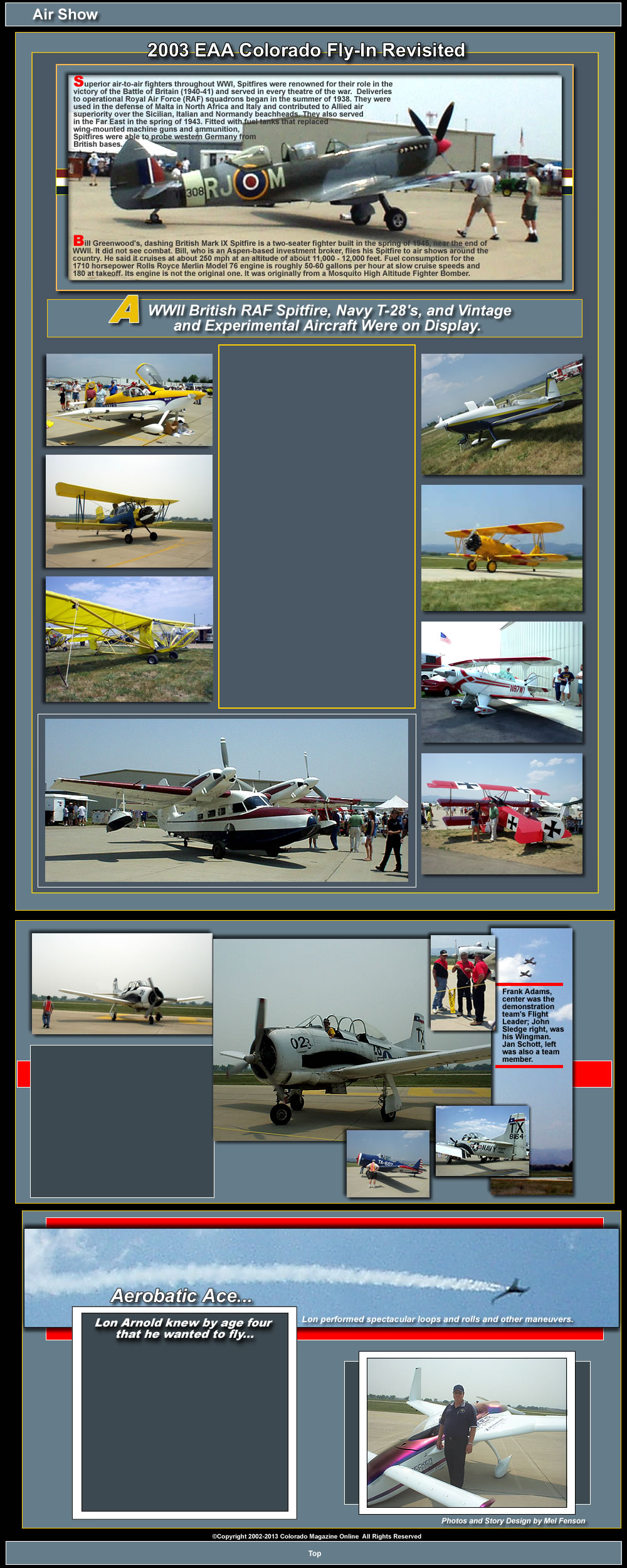 A couple of thousand people were on hand to participate in aviation activities, watch the air show and view the 300 to 350 aircraft that flew in from around the country for the event. The annual event was sponsored by local EAA Front Range chapters, which have about 500 members. The EAA, founded in 1953, has grown to a 170,000-member international recreational aviation organization with about one thousand local chapters. The name EAA evolved from the experimental aircraft flown by the original founders, which were modified or home-built and were required to display an EXPERIMENTAL placard on the door or in the cockpit. Homebuilt experimental aircraft are popular because they are not subject to the same maintenance requirements as factory built aircraft and homebuilt aircraft builders can obtain a "Repairman's Certificate" which allows them to conduct their own maintenance. Special performance capabilities can be engineered into experimental aircraft to provide the speed, responsiveness and aerobatic capabilities pilots of experimental aircraft want. The EAA now occupies a multi-million dollar, 150,000 square foot facility in Oshkosh, Wisconsin, which houses its Headquarters and AirVenture Museum. It's annual week-long convention, known as the EAA AirVenture Oshkosh, held at the Wittman Regional Airport in Oshkosh, Wisconsin, now attracts around 12,000 airplanes and over 800,000 spectators. It has become the showcase for cutting-edge aircraft from all over the world, as well as other aircraft, which include homebuilts, warbirds, ultralights, helicopters, aerobatic aircraft, vintage airplanes and general aviation aircraft. |
