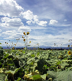 Field of Sunflowers in Berthoud, backdropped by Twin Peaks.