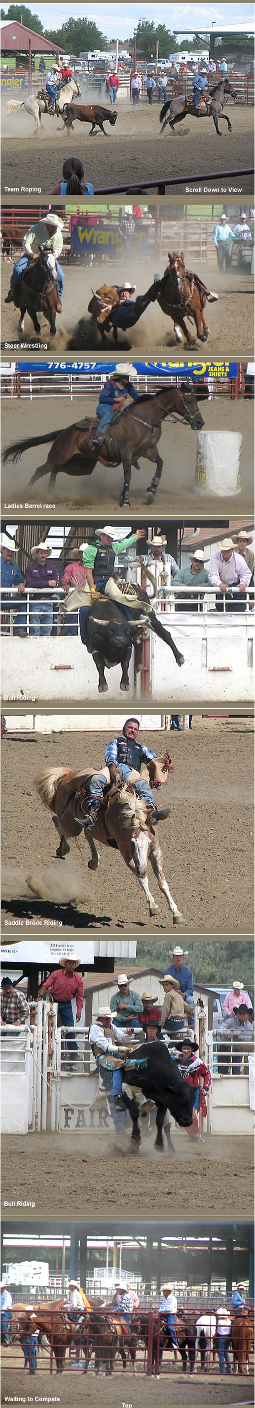 Rodeo events always include: calf roping, saddle bronc riding, ribbon roping, steer wrestling, ladies barrel races, team roping, and bull riding