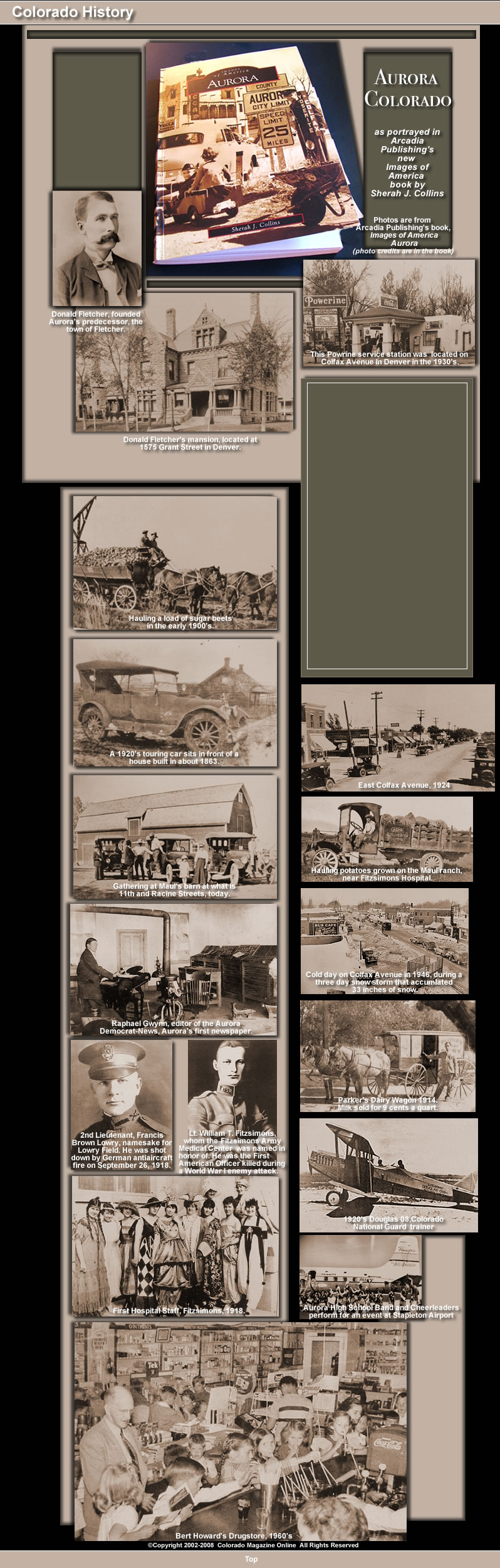 The town's colorful history is described in Arcadia Publishing’s 128-page soft cover book, published in 2008. Titled Images of America, Aurora, it was written by Sherah J. Collins, a Colorado author. She is a member of the Aurora Historical Society and the Aurora Museum Foundation. The story is portrayed through a wealth of black and white vintage photographs from the Aurora Historical Museum and numerous personal collections.