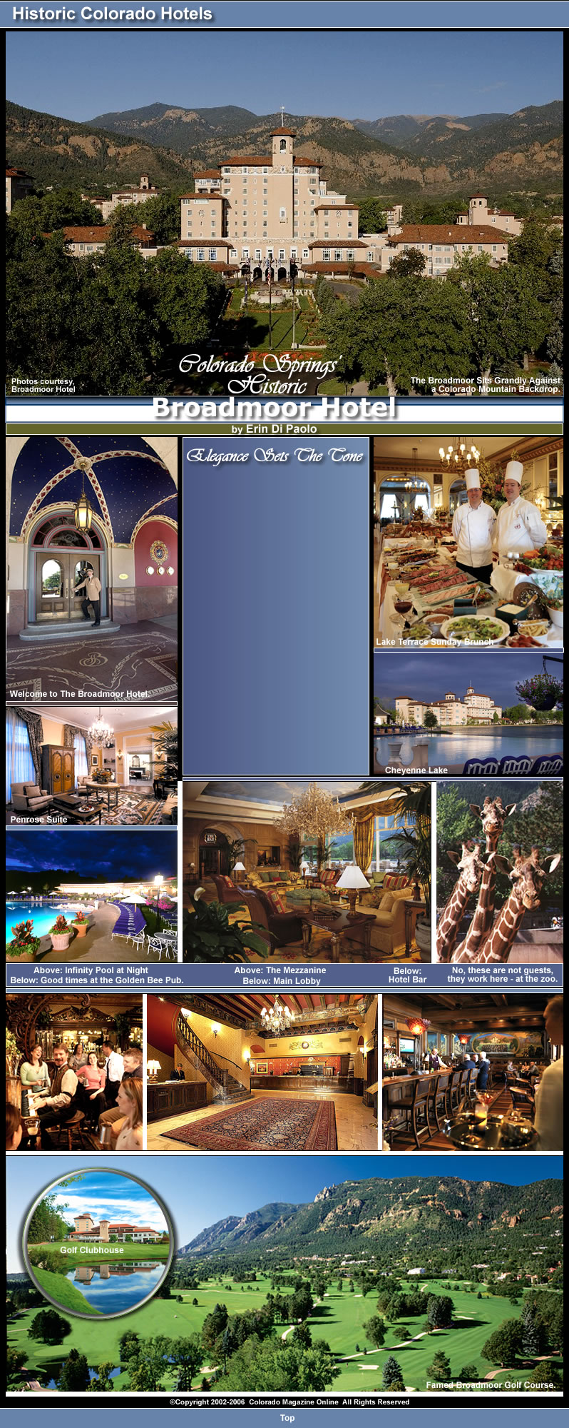In addition to those amenities already mentioned, others include 24-hour room service, a first-run movie theater, babysitting services, Bee Bunch children’s program (seasonal), and a laundry and dry cleaner on site. High speed and dial up internet connections are also available in each room. The hotel offers many special packages, all of which can be viewed at www.broadmoor.com. To make reservations or to get more information, visit the website or call 1-800-634-7711.