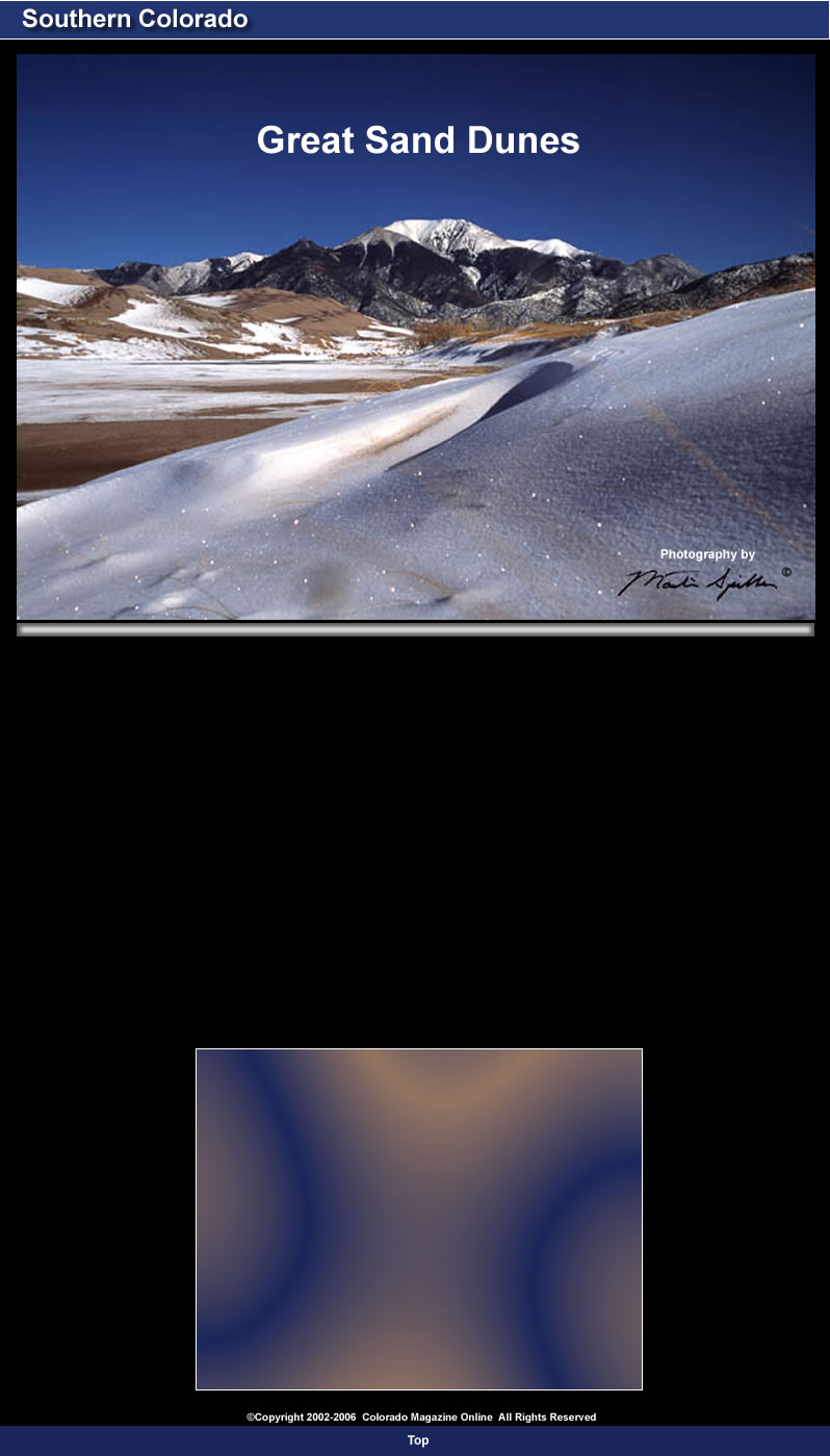 Winter scenes, as captured by photographer, Martin Spilker, depict the dunes’ solitude and quiet beauty, as well as their propensity to be interrupted by sudden storms. Winter at the sand dunes generally brings sunny, but chilly, clear days and nights. But the valley’s intense alpine sun can still warm the sand even on those days. At an elevation of 8200 feet, blizzards and subzero temperatures may occur at night. Summer temperatures average in the 80's, with lows at night averaging in the 40's. July and August can bring heavy afternoon rainstorms with dazzling lightning performances. In average to wet years, the Medano Creek, which runs through the sand dunes, begins to flow as a trickle in early April, then becomes a wide, fast-flowing stream at its peak in early summer. Be prepared to fight off hordes of mosquitoes and gnats in the springtime. Unless the mountain snowpack is high, the creek usually begins recede by mid-summer.
