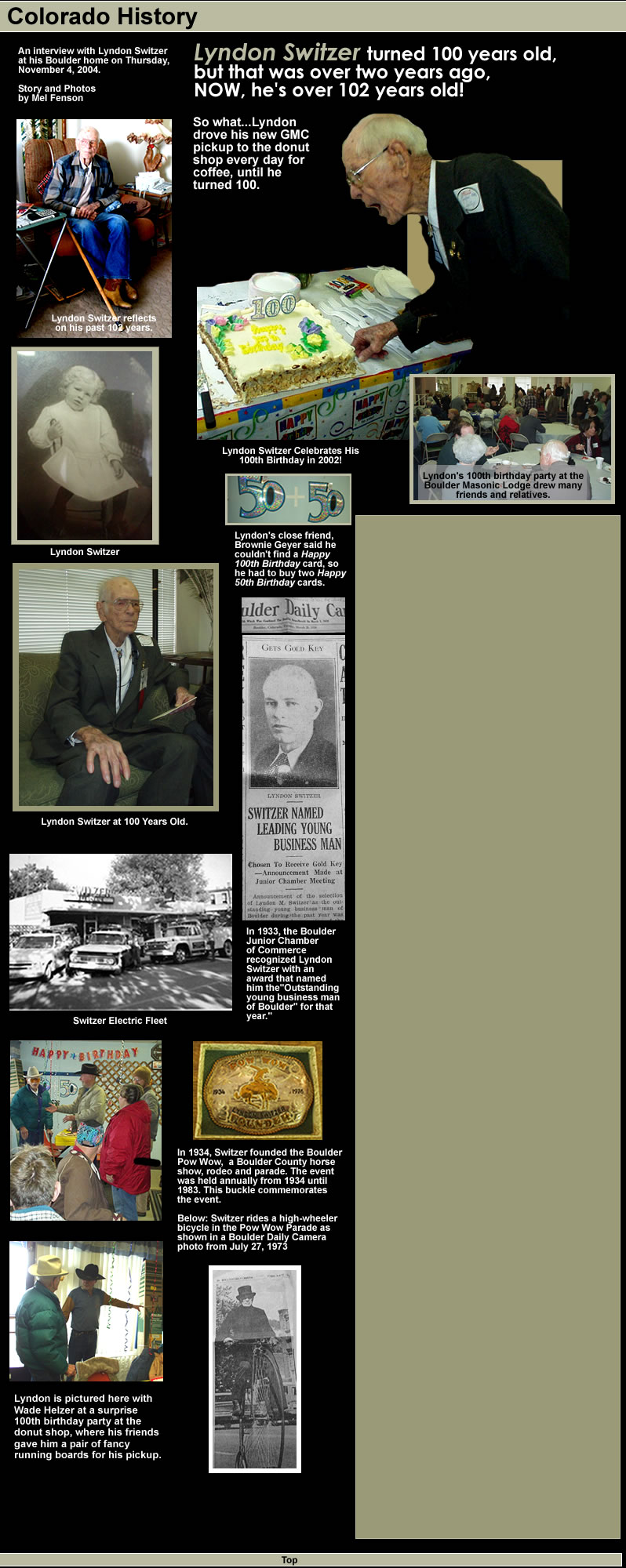Lyndon Switzer was born March 19, 1902 in the small town of Kingston, Missouri, which is about 45 miles south of Kansas City. His father, Amos R. Switzer, ran a livery stable there - with eight to ten horses. In addition, he also ran a freight line to haul supplies to Kingston from two nearby railroads - the Polo, Missouri Railroad and the Hamilton, Missouri Railroad. He also rented out horses and buggies to local town’s people. Lyndon's family then moved to Walnut, Kansas, in 1910, where his father bought a small farm. Lyndon attended a country grade there for three years. “I rode my pony back and forth to school, it was about a mile away. I kept the pony at the school in a shed during the day and I let the other kids ride it at the noontime meal. They gave me sweets and cookies in exchange, things that I didn’t get at home.” In 1913, his family moved to Harrisonville, Missouri , where his father bought another farm. They lived there for eight years. The first car Lyndon ever drove in was a 490 Chevrolet touring car, when he was about 14 or 15 years old. He said no minimum age or drivers license was required in those days. He had worked for the garage that sold them. When people bought cars, Lyndon would take them out to a hayfield on his dad’s farm, which was a couple miles from town, and teach them how to drive. He said he drove four stakes into the ground to mark a garage-like space, then told his student drivers to drive in between them to practice parking the car in a garage. “ I had a lot of fun teaching people how to drive. It was quite a deal to own one those 490 Chevrolets." In 1917, Lyndon’s dad sold his farm and moved the family to Boulder. They drove to Colorado in a 4-cylinder Dodge, which his dad had bought for $850, after selling the farm. Lyndon was 16 years old then. He said it took two and one-half days to drive the dirt road from Kansas City to Denver. On the way, they stayed in Limon and awoke the next morning to about four inches of snow. The going was rough until they got to the outskirts of Denver, where the the road was improved. “Cities had begun to put in crushed rock roads leading into town from just outside the city limits - to get you to come into town.” After they moved to Boulder, Lyndon's father joined a real estate firm there. The first car Lyndon owned was a Model-T Ford, which he and two friends stripped down to a seat and a gas tank and drove from Boulder to Yellowstone National Park in 1920. He was still in High School then. Since the car had no fenders and no windshield and since roads were dirt, the mud splashed all over them when they hit rain. He said, “We stopped in Thermopolis, Wyoming and cleaned up in the YMCA, because we were covered with mud.” Although the road was muddy, they never got stuck,"...but the wheels threw mud 10 feet high.” It only took them two days to get to yellowstone. Lyndon said, “We had a lot of fun on that trip.” Lyndon’s first airplane ride was on an airplane built in Boulder at a shop on 28th and Spruce Street. The company that built the plane had been in the business of manufacturing chains. The airplane was a 3-seater and carried a pilot and two passengers. The company started taking passengers up for 5 minute rides that cost $5. “The plane flew out of the Boulder Airport and circled over the edge of the mountains." Lyndon was 17 years old at the time. He got another opportunity to fly, when the Ford Motor Company, who was trying to get into the aircraft business at that time, brought a single engine plane to the Boulder Airport. It carried about 12 passengers and was taking people for rides. Lyndon’s grandfather, DP Stubblefield, who had fought in the civil war and was then retired, had come out to visit Lyndon's family in the summer. He offered to take Lyndon for a ride. He didn’t want to go alone, but he was willing to try the plane ride, if Lyndon would go with him. “We took off from the Boulder Airport and flew by Flagstaff.” Lyndon sat across the aisle from his grandfather. When he raised up, pointed out the window and said, “There’s a flag pole on Flagstaff, can you see it?” - his grandfather said, “sit down, you’re going to unbalance the plane.” Lyndon said, “ The plane had a little wobble to it and the wind would shift it one way or another, but otherwise it was a smooth flight.” His grandfather, thinking out loud, said, “ I drove an ox team, a horse and buggy, and now we’re flying in the air, that’s quite an accomplishment for me!” His grandfather was in his eighties, at that time. He died at the age of 92. Lyndon was graduated from the State Preparatory School in 1920, at the age of 19. The school, which no longer exists, was located at 18th & Pearl Streets in Boulder. Lyndon said, "That was before the present High School was built.” Lyndon attended a class reunion in 2002, which was held for all the school's graduating classes between the years of 1917 and 1937. It was held at the Boulder Country Club. About 100 people attended. Lyndon Switzer was the oldest person there. When Lyndon turned 21 in 1924, he voted for the first time in a presidential election. He voted for Calvin Coolidge. Lyndon worked as an electrician and owned his own business in Boulder for 51 years. He got into the business while he was still in High School. He had worked for and later managed an electric firm for three or four years. When the owner died in 1928, he bought the business and changed the name from Terry and Goodnow Electric to Switzer Electric. Switzer said, "The business involved wiring houses and stores - it was the beginning of the electrical wiring of houses. When I wired my first house, I ran two wires from the back porch to the front porch and used only one fuse for the whole house. There was no breaker, those came years later.” Lyndon closed his shop between 1942 and 1945 to help build Camp Hale in Pando, Colorado - in Eagle Park Valley - where the
