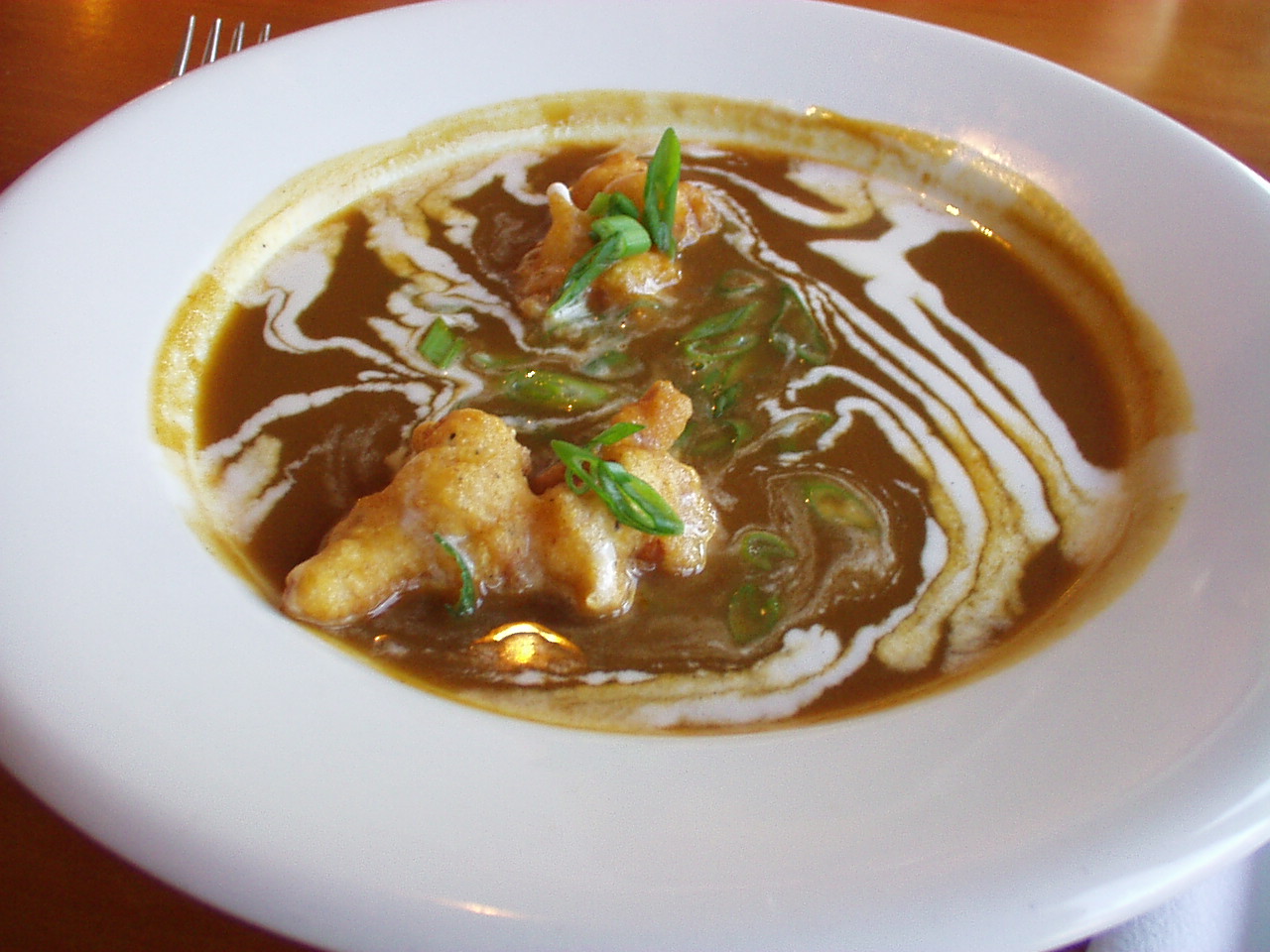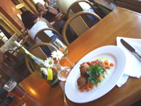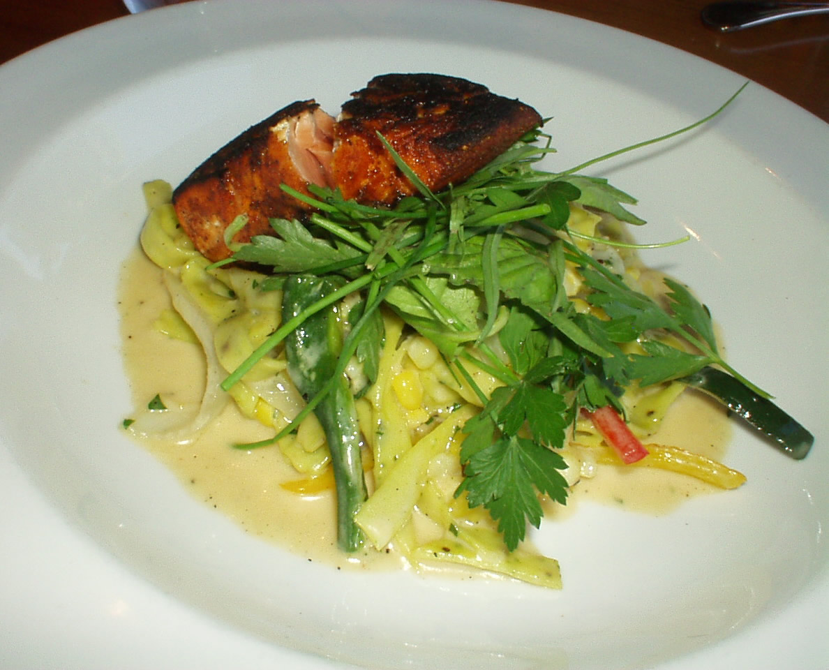 gorgeous but casual presentations, reasonably priced. In a hurry at lunch? Pictured here, three courses "served promptly." Really, truly Lobster Sweet Potato Bisque made from lobster bodies, no hint of base, and just enough sweet potato to bind and lighten with a pretty swirl of crème fraiche. Delicate rock shrimp fritters floated on top. Outstanding! A nice light, perhaps 4 oz portion of perfectly grilled Blackened Salmon, skillfully caramelized and "bronzed" rather than burnt, coddled with just enough fresh Parsley Black Pepper Fettucini Alfredo. The pasta was tossed lightly with straight imported Parmesan cheese and fresh cream. On the side a fresh salad garnish with today's sweet corn. ($15)