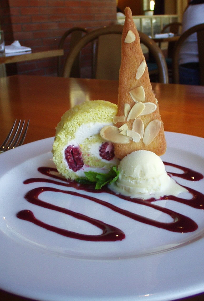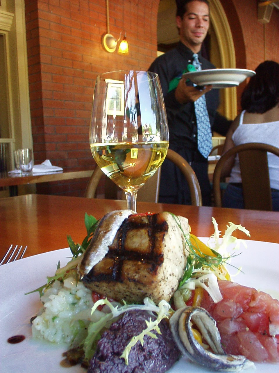I had to have the falafel (called Chick Pea Fritters) with properly cooked Cous Cous and tangy Tomato Chutney, plus drizzled low fat yogurt to moisten lightly. ($11) You'll find a lot of dinner preparations lightened up for lunch, and this is one ($16 at night with Spicy Sweet Potatoes.) For another dinner, we tried Grilled Ahi Tuna, Lemon Risotto, Sweet Peppers. Fennel, White Anchovies and Calamata Olives,($23) Seared and carved with a cool center, fine for me, but give warning anywhere today if you want more temperature. The risotto was a creamy arborio, delicate lemon flavor and just the slightest bite. And just for the hell of it, a small taste of tartare, so there's no doubt how fresh the fish is.
