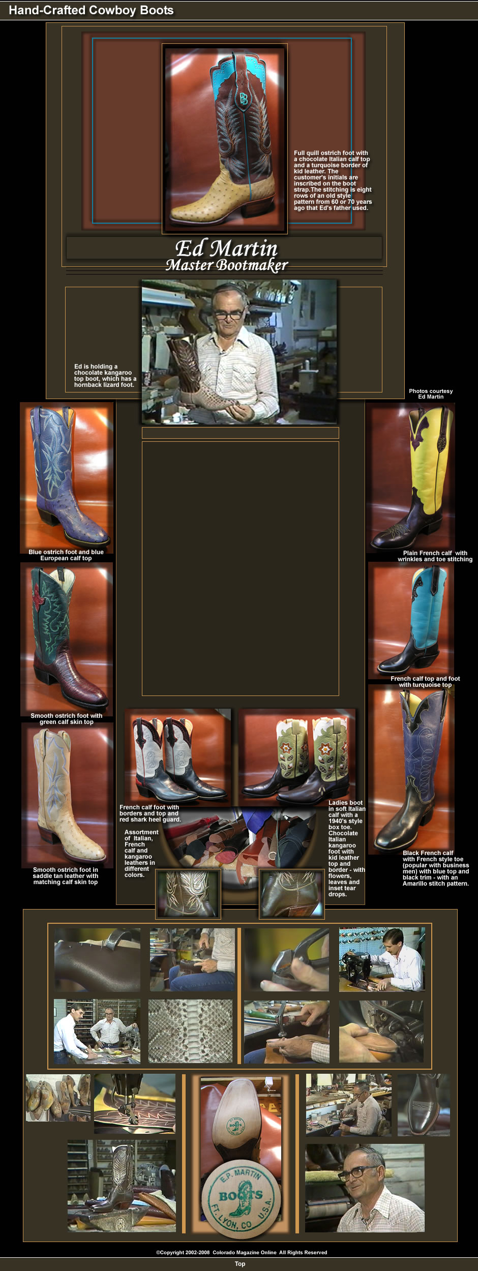 Ed crafts exquisite boots from many different types of leather, including exotic leathers such as, alligator, python, frog, lizard, kangaroo and ostrich. “I use a lot of kangaroo skin,” he said but, “...most of the boots I make are from Ostrich skin, because the leather is so supple and soft .” The most important thing, Ed notes, is whether the boots fit well. He says, “A perfect fit comes from perfect measurements of a foot and the construction of a last or mold that is fitted for each foot.” “A good boot,” Ed continued, “should feel good the first time you put it on.” Every boot Ed makes is custom made for the customer’s foot. “The most important thing I have to offer to our customers is a perfect fit or as perfect as I know how.”