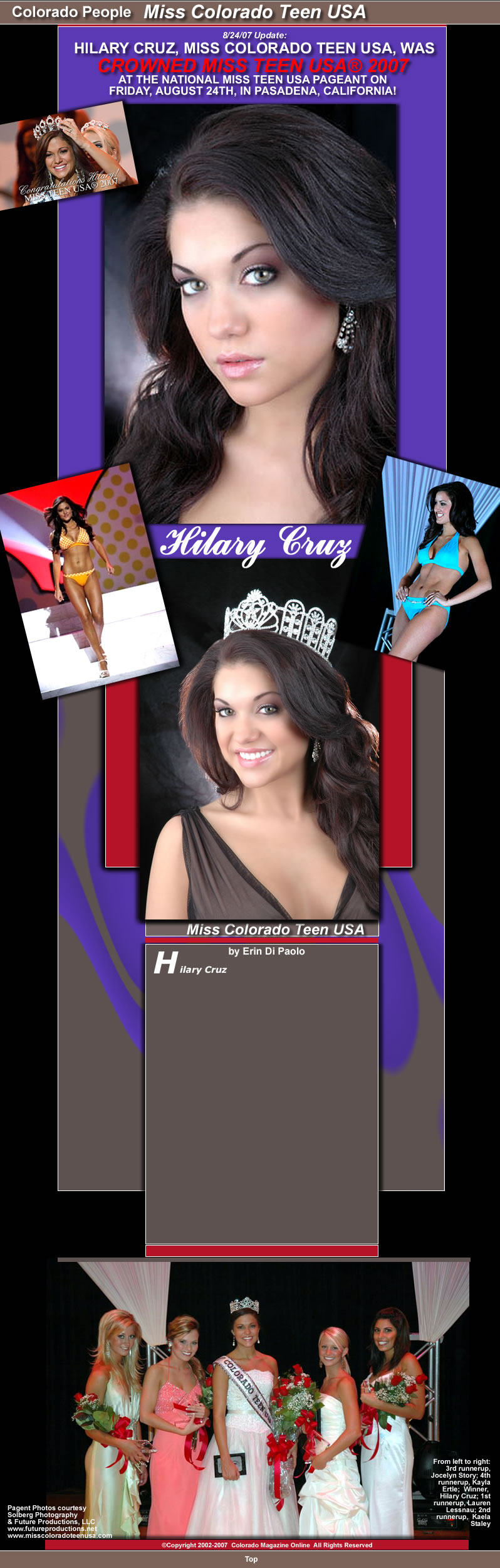 It has been said that the third time is a charm, but for Hilary Cruz, Miss Teen Colorado USA 2007, it was the first time that was magical for her. Before Cruz participated in the pageant that was held in Loveland, Colorado on September 23-24, 2006, she had never participated in a single beauty pageant. Apparently, a winning smile and the ability to look great in photos proved much more valuable than pageant experience.