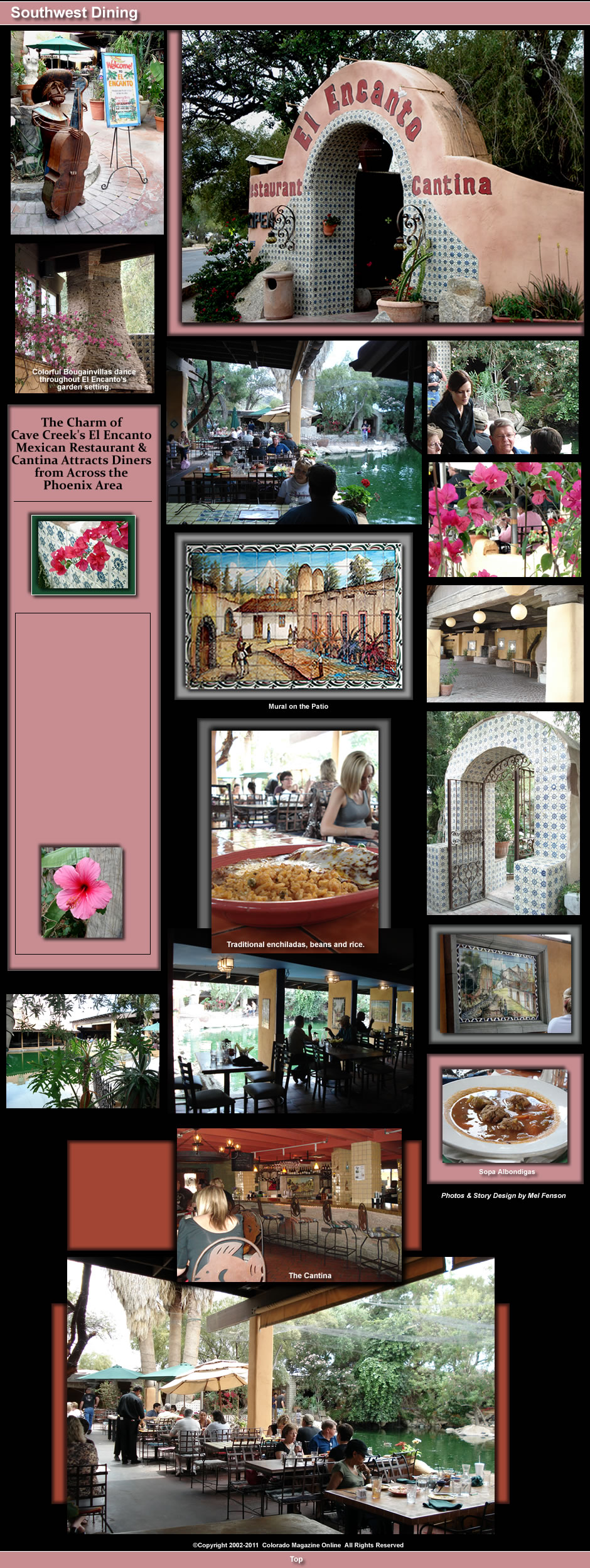 The El Encanto Restaurant and Cantina in Cave Creek, Arizona - 35 miles north of Phoenix - whisks diners away to a romantic Old World Mission style Bougainvilla- covered garden setting, next to a picturesque pond that’s alive with ducks, turtles, swans, owls, and blue heron. Throughout the restaurant, the decor is enhanced with the vibrant colors of Mexico, illustrated tile scenes and wrought iron accents - designed by local artists. Diners sit under a covered patio right next to the water as the efficient wait staff brings a variety of Mexican dishes from regions all over Mexico. The indoor/outdoor Cantina offers more than 40 different tequilas and a wine selection from Mexico, Spain, South America, California and Oregon. The Cantina Tapas Menu offers a selection of smaller items. Among the restaurant's specialties are Guacamole with fresh avocados, tomatoes, peppers, onions and fresh herbs; Cocktail de Camarones - with shrimp, avocado, cucumbers and spices; Green Chile Corn Tamales and Red Beef Tamales; Sopa Albondigas - Mexican meatballs in a savory beef broth with fresh vegetables; Enchiladas de Queso - corn tortillas stuffed with cheese, topped with red or green chile sauces and served with beans and rice; Enchiladas de Pollo con Mole - chicken enchiladas topped with mole sauce; Camarones de Tequila con Limon - shrimp, marinated in fresh garlic, cilantro, olive oil, citrus juices and Sauza Gold Tequila, then grilled; Plato de Carnitas - slow roasted pork, served with Tomatillo Chipotle sauce, cabbage, cilantro, black beans and fresh corn tortillas; Chile Relleno con Pollo; and Fajitas - marinated strips of chicken, beef or vegetables, mesquite grilled with fresh peppers and onions, served with warm tortillas, guacamole, beans and Pico de Gallo salsa. El Encanto was established in 1989 by Bill Nelson, who brought Chef Hernandez - whom he’d known for twenty years - from Mazatlan, Mexico to put together the Mexican menu and manage food operations. The creative concept for El Encanto came from Bill’s appreciation of old Mexican architecture. He made many trips across the border, to bring back ideas and materials to incorporate into the look of his restaurant. In 2003, Bill was joined by his daughter Christine, a lawyer from Washington, who came back to Arizona to help run the business. Christine and Chef Hernandez expanded the menu to add more fresh seafood and several of Chef Hernandez’s specialties from Mexico. The restaurant serves Monday to Sunday from 11am to 10 pm. Sunday Brunch starts at 9:00 am. For more information,