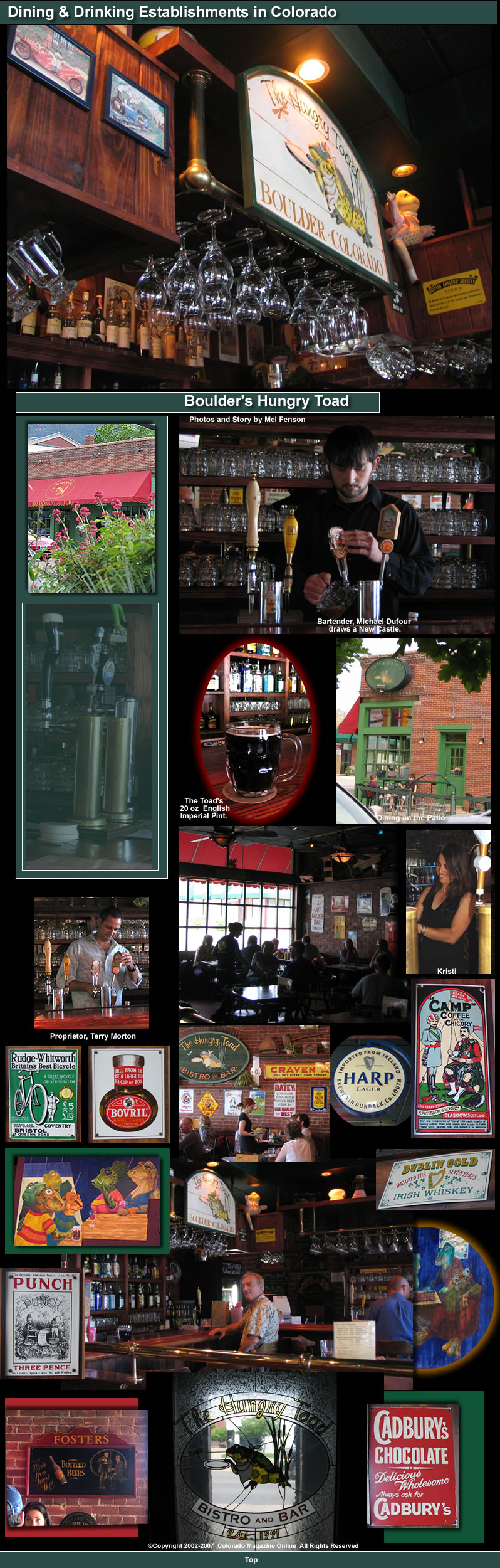 With a name that is typical of the fanciful and whimsical names the British give their pubs, such as The Pig and Whistle, The Fat Lady's Arms, The Rooster And Toad ,The Brick and the Plough, The Swan, The Dog and Duck, The Blue Boar, and of course, The Red Lion, The Hungry Toad’s name dates back to an old English literary reference. The Toad’s red brick walls are colorfully decorated with a variety of English advertising signage brought from the original Hungry Toad in England. Painted tin signs that adorn the pub’s walls were once promotions for a variety of British products, such as Camp Coffee with Chicory, Rudge-Whitworth Bicycles, Cadbury’s Chocolates, Punch Magazine, and Dunville’s Whiskey. Popular English and Irish brews on tap at the Toad include Guinness Stout - with its creamy, bitter, roasty character, and Newcastle Brown Ale - a medium light-bodied ale, brewed with both pale and dark caramel malts. It has a reddish-brown hue, a mild bitterness, and aromas that hint of sweetness and caramel character. Another ale on tap is Old Speckled Hen - a light cream pale ale that is similar to Boddingtons, which is also on tap - it's from Manchester, England and known as the cream of Manchester. Other beers on draft are Harp Larger, brewed by Guiness, and Fullers ESB - which has a rich amber hue, a toasty malt aroma and a rich hoppy flavor. There’s also always a seasonal tap - currently Steamworks Larger - from Durango, Colorado. The Toad combines Fullers ESB and Guiness for its popular Black and Tan. A local beer on tap is Belgium Brewery’s Fat Tire from nearby Fort Collins. The pub also offers a variety of domestic and imported bottled beers, plus a full bar. The Toad draws a generous 20 oz English Imperial pint. The Hungry Toad’s pub fare offers a wide choice of English, American, Italian, Mexican, and Continental favorites - including appetizers, salads, sandwiches and entrees. Fish Chips tops the list of favorites, which also includes the pub’s tasty selection of hamburgers and English specialties, such as Shepherd's Pie and Bangers and Mash. Many items are priced under $10. Happy