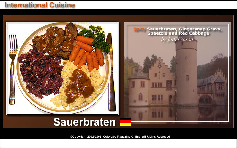 Sauerbraten is prepared by marinating pot roast in wine and spices and refrigerating it for 3-5 days. The aroma of the cooking sauerbraten is mouthwatering and irresistible. Several traditional accompanying dishes are spaetzle (tiny dumplings), gingersnap gravy, and red cabbage. There are many variations for the sauerbraten and red cabbage and the recipes provided are a compilation from multiple sources.
