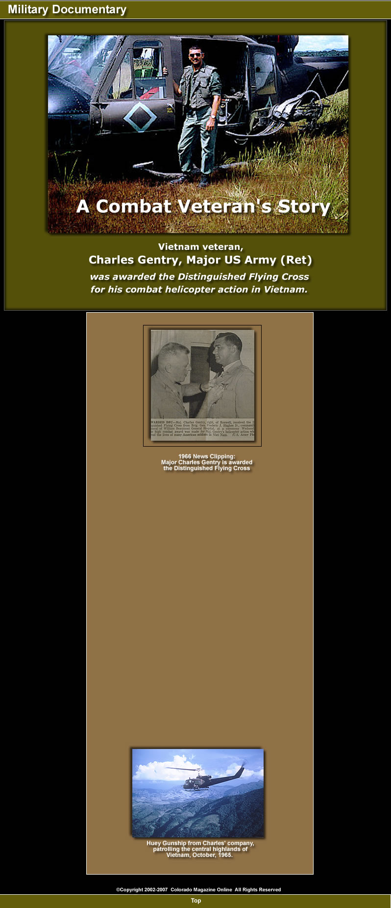 by Mel Fenson Charles Gentry was graduated from New Mexico Military Institute in January 1956, received his commission at that time and became a 2nd Lieutenant in the U.S. Army. Charles was a native of Roswell, New Mexico and had been a 1952 graduate of Roswell High School. He attended New Mexico Military Institute from 1952 to 1956. He was a Bronco football captain and lettered four years in football at NMMI. He was also New Mexico State Golden Gloves heavyweight champion in 1954 and had participated in track and baseball. Following his commissioning, he reported to Fort Belvoir, Virginia, where he completed the U.S. Army Engineer Officer’s Basic Course. Following that, he was assigned to Fort Hood, Texas, where he was assigned to a combat Engineer Battalion. While he was at Fort Belvoir, he was accepted into Army Aviation training, which he started in January 1957. Upon completion of the course, he received his wings as an army aviator with a fixed wing rating and was then sent to a 3-month helicopter school at Camp Walters, Texas. During the course of his career, Charles has accrued over 2700 hours of helicopter mission time - with more than 100 hours of combat flying.