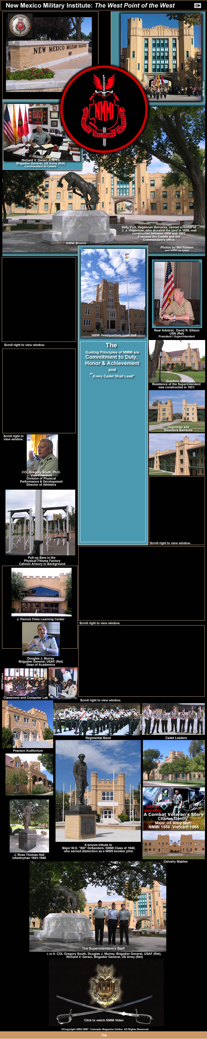 Betty Arden Boellner Jones With the bugle call of reveille at dawn each day under vast blue New Mexico skies, New Mexico Military Institute, located in Roswell, New Mexico, continues its over 100 years tradition preparing the next generation of leaders for our nation. Founded in 1891 as the Goss Military Institute, through the efforts of Captain Joseph C. Lea and Colonel Robert S. Goss, it was patterned after the prestigious Virginia Military Institute. The Institute was created to train aspiring cavalry officers and continues today to train tomorrow's military leaders. With challenging academics, an exceptional faculty and leadership preparation and character development programs which produce outstanding military leaders, NMMI includes a four year college preparatory program and a two year junior college. It is one of five Military Junior Colleges in the United States and remains the only state-supported co-educational college preparatory high school and junior college in the United States. Accredited by the North Central Association, NMMI became a coed institution in 1977 with a current twenty percent female enrollment. Designed by architects, I.H. and William Rapp, NMMI's classic architecture, originally referred to by the designers as "Scottish Castle" style, is known as Military Gothic. Its distinctive features include crenelated parapet walls with corner towers and the distinctive yellow color of 1907 Kansas Buff Brick. NMMI is listed on the New Mexico State Register of Cultural Properties and nominated for the National Register of Historic Places. The campus hosts 21 major buildings situated on 300 acres. The buildings encompass classrooms, barracks, dining facilities, entertainment facilites, athletic fields and courts, a parade field, leadership confidence and reaction course fields, high and low rope courses, an indoor swimming pool and diving facility, and an 18-hole golf course. The J. Penrod Toles Learning Center houses the Paul Horgan Library with 70,000 volumes, the Student Assistance Center and Writing Center. Currently under construction is a new Athletic Training facility that provides trained technicians and up-to-date medical technology equipment to handle student and sports medical needs. NMMI is wired with the most current technological facilities, including computer, audiovisual, video editing labs, and internet access. The Horgan Library hosts computers equipped with the latest software and hardware to help students study, learn computer skills and communicate via e-mail. Multimedia presentations, interactive testing and computer-aided learning are utilized to help cadets expand their intellectual horizons. In addition to academic resources, cadet life at NMMI provides the opportunity to participate in professional clubs, honor societies and activities, such as martial arts and fencing. The NMMI Leadership Complex is comprised of the Daniels Leadership Center and the Yates Leadership Challenge Complex. The Yates complex challenges cadets with a ropes Course and a Leader Reaction Course and provides an environment in which cadets learn teamwork, leadership, problem solving and self-confidence. Mens and womens Interscholastic and Intercollegiate athletics, including football, baseball, basketball, volleyball, soccer, cross-country, tennis and golf all play a big role at NMMI. NMMI’s black and red school colors are worn by the Jr. College team, the "Broncos," and the high school team, the 'Colts." A life-size bronze statue of a 'bucking Bronco' which depicts the spirit of NMMI is displayed in Bronco Plaza between the cadet barracks and the headquarters building. Fitness is an integral part of the NMMI mission. The Godfrey Athletic Center offers excellent sports and training facilities for fitness, weight training, racquetball, volleyball, swimming, indoor soccer and basketball. NMMI grants High School diplomas and Associate of Arts and Associate of Science degrees. Approximately 95 per cent of NMMI graduates go on to complete a four-year degree in other outstanding schools, such as Harvard, Stanford, Rice, Cornell, University of Texas, Arizona State University, Penn State, University of Colorado and the nation's Service Academies. NMMI's ROTC Program offers college cadets the opportunity to receive a commission in the U.S. Army through a 2-year Early Commissioning Program. Cadets at the college level receive military training through the U.S Army Senior Reserve Officers Training Corps (ROTC) program. Cadets at the high school level receive training through the U.S. Army Junior ROTC program. Cadets may also pursue commissions in the U.S. Army , Air Force, Navy, Marine Corps, Coast Guard, or Merchant Marines through NMMI’s Service Academy Preparatory Program. NMMI graduates have applied their many leadership skills and fought for their country with courage and valor in two World Wars, Korea, Vietnam, Afghanistan, and Iraq. Many of them have given their lives for their country in military action. Within NMMI’s Regimental System, the Commandant of Cadets at New Mexico Military Institute, supervises and mentors the Corps of Cadets, which is organized as a regiment, based on the history and composition of a Cavalry Regiment. The Corps of Cadets consists of three squadrons of four troops each, and a Regimental Band and Headquarters Troop. Cadets drill under the supervision and training of their own troop leadership. Cadets are appointed to commissioned and non-commissioned cadet rank on the basis of demonstrated qualities of leadership and proficiency in academics, military studies, leadership, and physical fitness. The Regimental Commander is the highest-ranking cadet and commands the Corps of Cadets through a Regimental Staff. At the squadron and troop levels, cadet officers and their staffs share a major role in the administration, leadership, and training of the Corps of Cadets. NMMI’s key mission - to produce leaders who are capable of critical thinking and so