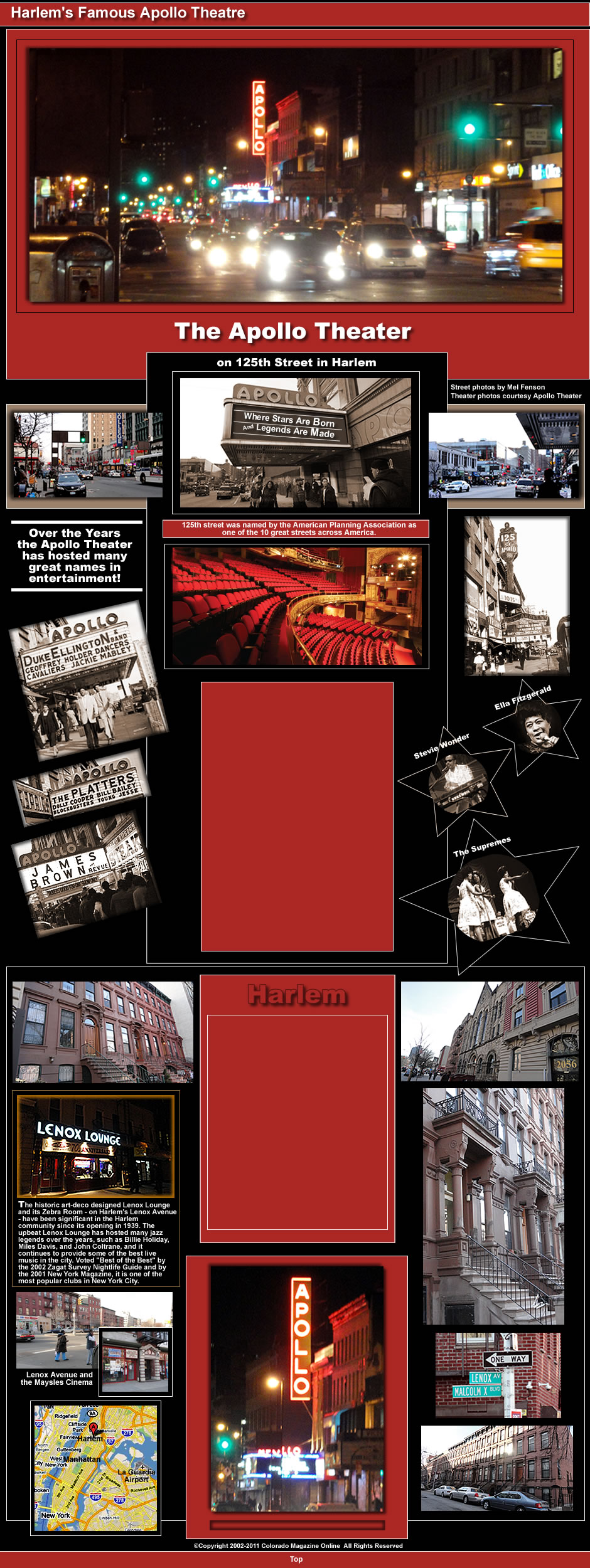 source of income for artists. In 1981, the Apollo theater was purchased by Inner City Broadcasting, a firm owned by Percy Sutton, a prominent lawyer and technology executive, and a group of private investors. Under his ownership, the Theater’s facilities were expanded with a recording and television studio. The Apollo received state and city landmark status as Harlem’s oldest functioning theater in 1983. On May 5th, 1985, a renovation of the Apollo was celebrated with a 50th Anniversary grand reopening and a television special, “Motown Salutes the Apollo.” “Amateur Night” was re-launched that same year and “Showtime at the Apollo” was revived and launched as a television show. In 1991, the Apollo Theater Foundation, Inc., was established as a private, not-for-profit organization, to manage, fund and oversee programming for the theater. The Foundation launched its first performance series with a tribute to Dr. Martin Luther King, Jr. That was followed by performances that included the Alvin Ailey Dance Theater, the Boys Choir of Harlem, and the Betty Carter - Jazz Ahead ’95. Tony Bennett also played a sold-out engagement that honored Billie Holiday. In 2002, George C. Wolfe’s musical Harlem Song opened at the Apollo. In 2005, the theater hosted its inaugural Spring Benefit Gala with a special tribute Ossie Davis. In December, 2005, a $65 million theater refurbishment project was initiated. The first phase included a new facade and a new marquee, a new stage, and the installation of over 1,500 new house seats. Today, the Apollo Theater, which functions under the guidance of a Board of Directors, continues to present concerts, performing arts, and education and community outreach programs. An Apollo Theater Archive Project has also been launched to organize and preserve historically important costumes, documents, photographs, recordings, memorabilia and other items related the the theater’s history, and to maintain documentation of the theater’s current activities, such as performances and programs. Edited by Mel Fenson from information derived from the Apollo Theater website, Wikipedia, The New York Times and other web sources. It should be noted that our research has discovered some conflicting dates and other information that could not be verified. For