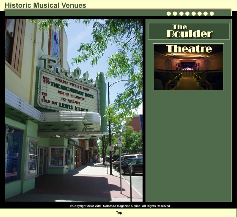 Recent appearances on stage at the Boulder Theatre have been national acts, such as, Tory Amos, Blues Traveler and Branford Marsalis. The theater is also now home to E-Town, the nationally-syndicated radio show. Because of its unique facilities, the theater, located at 2032 14th Street in downtown Boulder, also provides a venue for other diverse events ranging from corporate parties, meetings, and conferences to private parties and concerts.