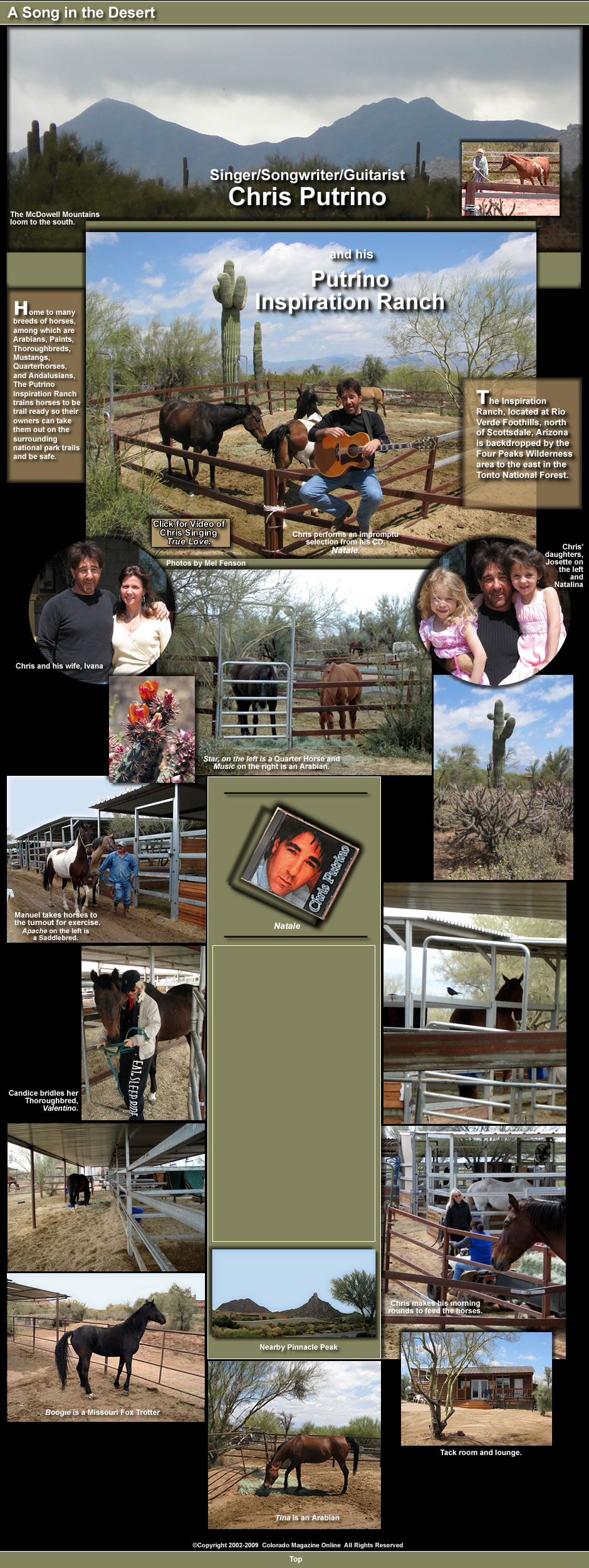 Chris is also a horse rancher. His Putrino Inspiration Ranch, in Rio Verde Foothills, about 20 miles north of Scottsdale in the heart of the beautiful Sonoran desert borders the picturesque McDowell Mountain Preserve and wildlife area. He said, “I was always interested in animals and I had always wanted to play music and have a ranch ever since I was a kid.” He used to ride neighbor’s horses bareback when he was young. He was also influenced by his uncle, who was a veterinarian and had once considered becoming a veterinarian. His ranch environment provides him with the inspiration and serenity to write his music, commune with nature and be with horses.