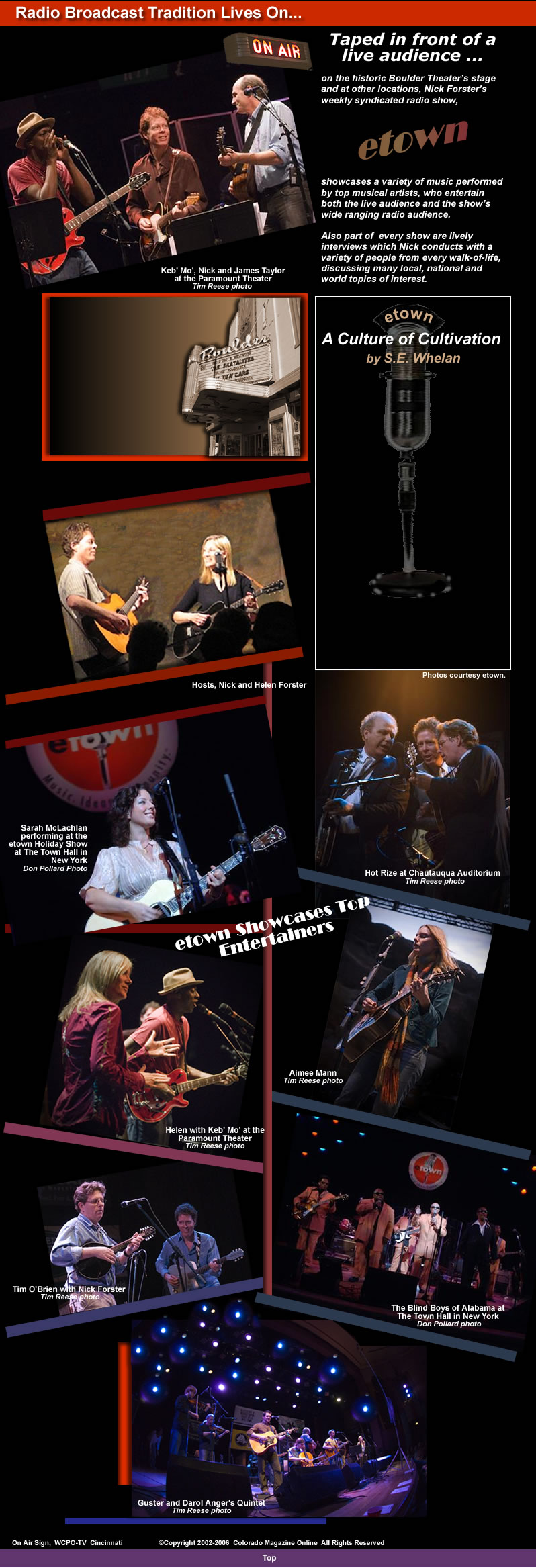 Culture, according to The American Heritage Dictionary, is related to cultivation, a word that invokes images of sowing seeds, promoting growth. In this way, someone like Pete Seeger becomes something like a seed. Love or hate folk music, there are few of us that can't hum a few bars of Seeger's "If I Had a Hammer," and so generations find that, like it or not, there's something that has been sown. There's a song we know without knowing why. Within this larger context, a person like Nick Forster comes into focus. Forster, an accomplished musician, whose bluegrass band Hot Rize was nominated for a Grammy, appeared on "The Grand Old Opry" and "Austin City Limits," was well on his way to living comfortably as a musician. But Forster traded it in for, of all things, an independent nonprofit radio program aimed at educating, entertaining, and celebrating our eclectic local and international culture. From Seed to Germination As the story goes, in 1990 Forster visited Bulgaria and lent his musical talent to the State Department, playing in the first open, public concert in the formerly communist country in 40 years. Imagine Forster, strumming his guitar for this audience newly united, thinking of home, his childhood spent in small town, upstate New York, his days and nights spent listening to the radio, the news and Pete Seeger's campaign to clean up the battered Hudson River. Looking out among the crowd, Forster remembers, "I was reminded of the amazing power of music to bring people together. It's unifying." It seems the opportune time for a Pete Seeger whisper, for something to germinate. What sprouted was something Forster called etown, a community on the air formed in 1991 in Boulder, Colorado with the help of Helen Forster, Nick's wife. "I had been touring for fifteen years," recalls Forster. "I was a single dad, and I wanted to be home more for my kids, and I really wanted to have something that reflected my values and my personality." Values rooted in a family tree whose branches extend through an impressive list of artists, politicians, designers and diplomats, and can be traced all the way back to the Mayflower. As Forster talks about the lineage, which include signers of The Declaration of Independence and Julia Howe Ward (writer of "Battle Hymn of the Republic" and the founder of Mother's Day), one gets the impression that social responsibility and a desire to cultivate the ideals of the commonwealth is more than natural. It's inherent. "We have a commons," says Forster, "and that includes our natural resources, our financial resources, our laws, and our culture, arts and music. We have a responsibility to take care of those things and make sure that, in fact, they are managed in a sustainable manner." In this way, etown seeks to inform its listeners and, through education and entertainment, provide a sense of community by cultivating a wider audience for a sector of the common American culture. Breaking Ground This might seem an unattainable ideal until one listens to a broadcast, or better yet, attends a taping. Forster is an easy and personable host, a style colored by his experience as a guest on Garrison Keillor's popular radio program "A Prairie Home Companion." "Radio is a very personal means of communication," says Forster, "and I learned a lot of that from Garrison Keillor. Watching him on stage telling a story, weaving these fictional tales to an audience of a couple million people, knowing that each of them was taking it in as a personal conversation." This attention to engaging each audience personally combined with the variety show format lends itself to improvisation and the possibility of rare and unpredictable moments. At the 15th Anniversary Show in Denver, on May 16, 2006, through Forster's informal interviews, listeners learned that when Keb Mo was growing up he hid folk music in his car like a dirty secret, and that James Taylor, though renowned for his harmonic vocal arrangements and soothing melodies, can't read music. The listener will also be treated to uncommon collaborations between seemingly dissimilar artists-Keb Mo and James Taylor's performance of John Lennon's "Imagine" being one of a long list of exciting pairings that have occurred over etown's course. And yes, thrown in to the mix will be a little education via the e-chievement award, an honor designed to recognize individuals who strive to make a positive difference in their communities. "The idea is to go deeper than just playing music or selling advertising," says Forster. "It's an experience to share." In no small way the quality of that shared experience is guaranteed by the musicianship of Forster and etown's house band, The etones, who master the eclectic array of musical styles presented on the show often in one rehearsal. "I get to play Chicago blues with Charlie Musselwhite, then I'm playing banjo with Ricky Skaggs or Doc Watson," says Forster. "It's an amazing musical opportunity, and really challenging." The Idea Grew Fifteen years later it seems Forster's attention and cultivation has paid off. 230 radio stations broadcast etown nationally through NPR and both commercial and public stations. The show can boast an impressive and diverse list of celebrities that includes musicians like Ben Harper, Shawn Colvin, Natalie Merchant, Willie Nelson, Dr. John, The Fray, Ani DiFranco and Chris Isaak; scientists like Jane Goodall; and politicians like Jimmy Carter. Looking fifteen years into the future, Forster hopes for continued growth and the expansion of etown's audience. In January of 2006 etown policy changed, free ipod broadcasts began and the days of selling the show to interested stations ended. Listeners are now able to download the show from etown's website free of charge, and the organization has plans to digitize its content for wider distribution and to share its treasure trove of rare performances and interviews. Check the website for information on future guests and where to find e