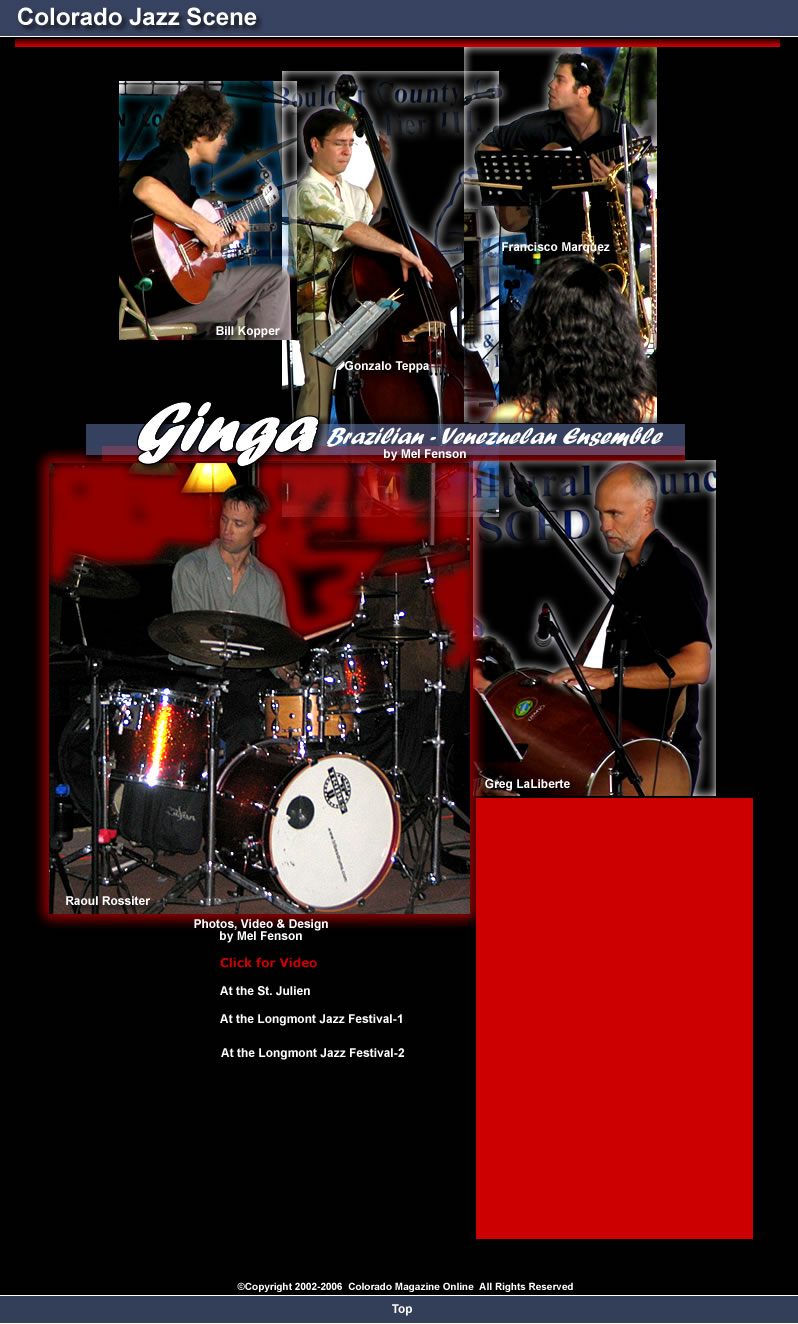 Ginga is currently playing at Boulder’s St. Julien Hotel on Tuesday nights from 7:00 p.m. until 9:00 p.m. Ginga will also be playing at Boulder’s Rhumba restaurant on the Pearl Street Mall on some coming Sunday afternoons, with a dance oriented vocal sound in the Brazilian genere.