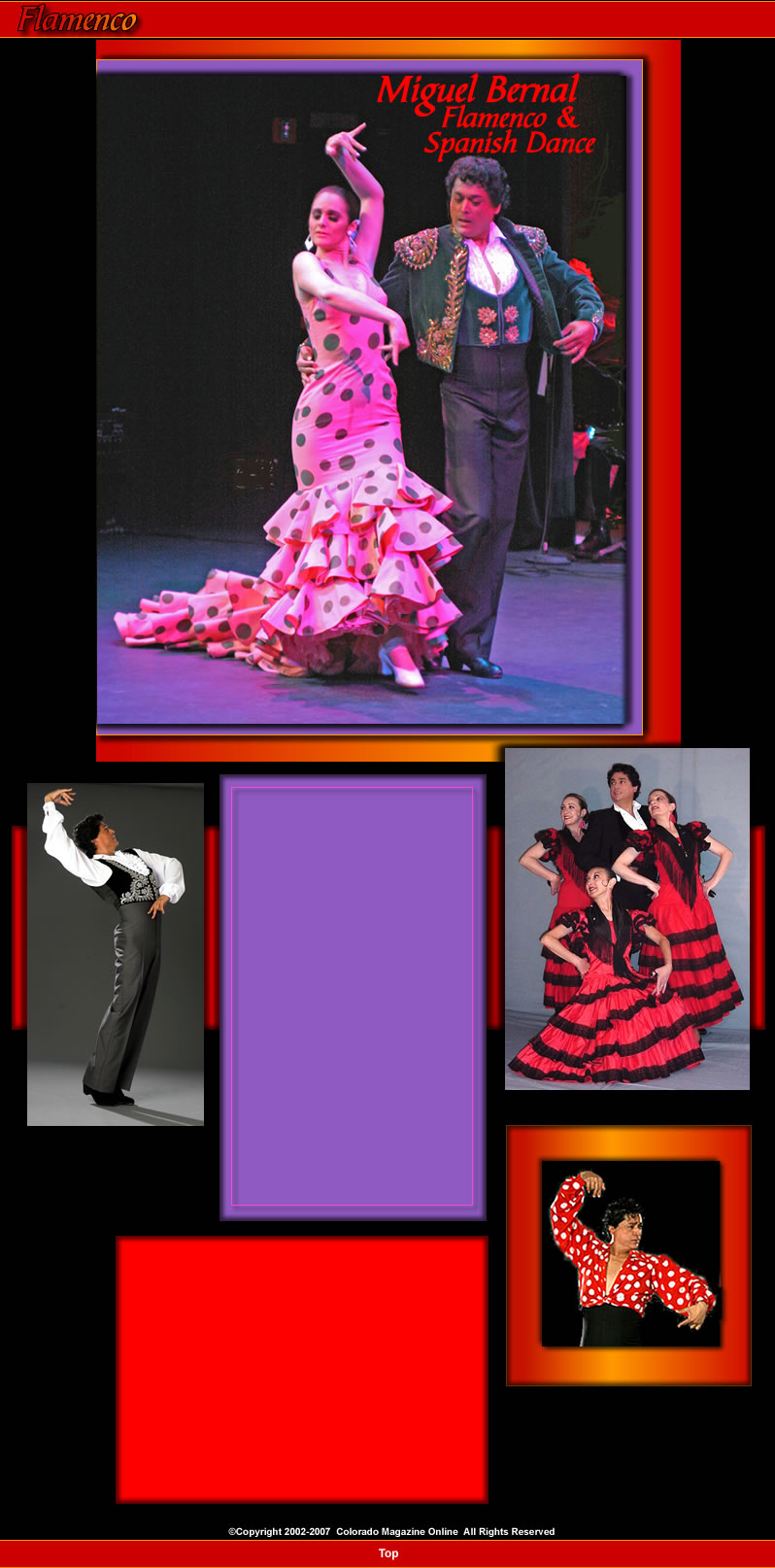 Miguel Bernal began his professional dance career in Los Angeles, originally performing with his sisters as the Los Hermanos Bernal dancers. During his career, Miguel has performed with many Latin and Hollywood celebrities, including Maria Victoria, Tito Guizar, Tony Curtis and Ricardo Montalban. In the course of his versatile training, Miguel has participated in comedy seminars with Lucille Ball in Hollywood, studied theatre dance and performance with Gene Nelson - who later directed him in the stage musical Magdalene. Miguel’s Hollywood experience has included performances in musicals, such as, Columbia Pictures Lost Horizon, which starred Liv Ullmann and Bobby Van, and Annie Get Your Gun, The Music Man, and Godspell. Miguel studied with The Ballet Folklorico of Mexico in Mexico City, and he studied Flamenco there with Joaquin Fajardo and Manolo Vargas. He performed in various venues, while he was in Mexico. He returned to Los Angeles to study Classical Spanish dance and Flamenco with Carmelita Maracci and Inesita. He then traveled to Madrid, Spain, where he studied with Faico, Rosario, Martin Vargas, Eloy Pericet and his mentor Pilar Lopez. Upon returning to the United States, Miguel performed around the country as guest artist with various dance companies in theatres such as, The Summerland Theatre in Las Vegas, The Tower Theatre in Bend Oregon, Art on the Green in Coeur d'Alene, Idaho, and in Los Angeles at the Dorothy Chandler Pavilion, Barnsdall Theatre, Wilshire Ebell Theatre, and The Madrid Theatre. Among the many other California venues where Miguel has performed are: the Coronado Hotel, Disneyland Hotel, Beverly Hilton, Los Angeles Biltmore Hotel, Century City Hotel, the Wilshire Country Club, The St. Regis Century City, Queen Mary, Hollywood Palladium, Petersen Museum, and the Armand Hammer Museum, . Miguel performed in Luisa Triana's tribute to Jose Fernandez, and with the Lupe Del Rio Dance Co., Lola Montes Spanish Dance Co., Chinin De Triana, Inesita. He was a soloist with the Jose Greco & Nana Lorca Dance Company which performed throughout Southern California with the Boston Pops. Miguel recently performed at New York State University in Fredonia, N.Y. and other recent engagements included a guest artist appearance with the Marina Symphony Orchestra in Manuel De Falla's El Amor Brujo. He has danced at El Cid Flamenco Restaurant, once the leading tablao of Los Angeles and at other tablaos including, The Barcelona, Cava, Sangria, Casa Escobar, Cafe Sevilla and La Luna Negra. Miguel has made many television appearances, most recently The Latin Grammy's, The Passion of Flamenco and the award-winning, The Spirit of Flamenco filmed at Time/Warner Studios in San Diego. Miguel & Co. recently completed a film documentry on Flamenco for Pro-Vision TV, which will be distributed in Japan. He was interviewed on local Los Angeles talk shows for KNLA Latino-TV Channel 27 and on USC Trojan University TV. Miguel is also a dramatic actor and participated with The Bilingual Foundation of the Arts, touring in productions of Garcia Lorca plays, Dona Rosita La Soltera and Bodas De Sangre with Carmen Zapata. In addition to his acting and dance career, Miguel has been a contributing writer to magazines such as, Films of the Golden Age and Classic Images. He has written biographies of Hollywood entertainers, such as Desi Arnaz, Elsa Lanchester and his pen pal and mentor of many years, famed tap dancer Eleanor Powell. During his career, Miguel has received praises for his dancing from many people. He has been called, “A serious and profound dancer" by Spanish Dance Legend, Jose Greco and the LA Weekly wrote, "Who could not be entranced by the passionate dancing of Miguel Bernal." Actor, Hal Holbrook and Actress Dixie Carter commented, "Miguel Bernal's flamenco appearance is one of the most stunning theatrical evenings we have had-elegant, passionate, and exciting. We were enchanted." Miguel recently relocated his dance company to Denver and will soon be planning some engagements in Colorado. For