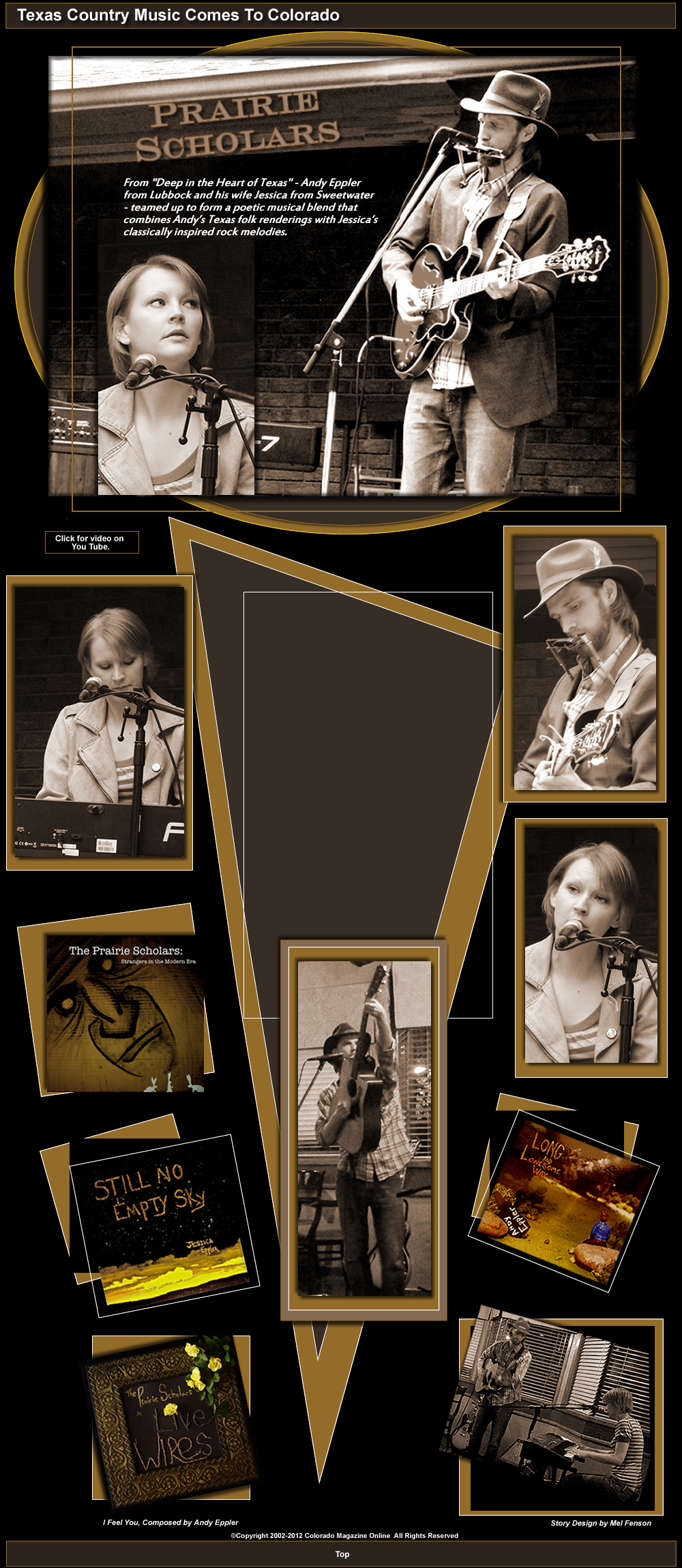 his own CDs. Andy’s wife and musical partner, Jessica, who is 25 years old, moved from Sweetwater, Texas to Levelland, Texas to enroll at South Plains College. Her captivating songwriting and classically inspired musicality quickly drew attention to her talent. Singing and playing keyboard, she performed in a band named, Clandestine Amigo, which played venues across the Texas south plains area. She met Andy, while at college. Jessica has always been involved in music. She recalls, “As far back as I can remember I have memories of music. I grew up in a musical family – my mother was a piano teacher and I remember being impressed by meticulously memorized piano pieces at recitals we attended. I also remember the music at church and the emotions it stirred. ”She explained that, “Somehow, those two branches of music twisted together in me as I grew up.” She added, “An emotionally strong musical performance moves me like almost nothing else can. It’s not something you can touch physically, but you can still feel it deeply. It penetrates the skin and touches some invisible set of nerves in your chest, stomach and head. To me, the best kind of music is passionate and purposeful.” In 2009, Jessica released her first live recording titled, “Clandestine Amigo.” Both Andy and Jessica earned their college degrees in commercial music, which was a music degree combined with business studies. Andy said along with learning about audio production in a recording studio, they were also taught how to read both music and contracts, while at South Plains College. They were still living in Lubbock, Texas in 2007, when Andy toured Colorado for several weeks to promote a new album. He said, “I simply fell in love with the place and realized that, as recording artists, Jessica and I could live anywhere and still sell our music online.” So they decided to move to Colorado because, “it felt good and offered us the opportunity to learn more about bluegrass because of its popularity there." Andy and Jessica teamed up to play music and were married in 2006. They moved to Colorado in 2009 and the Prairie Scholars was born. They formed their own recording company, Velvet Syntax Publishing, to produce their own label and CD’s. They built a recording studio in their house and have been producing records there since 2008. They have recorded and released ten collections since then. The name Prairie Scholars originated as a result of their Texas high plains heritage. Andy described Texas as a, “huge, flat, hot place with a history of churning out great art.” He said, "Because we have studied the history of art and music in the Texas plains country and understand the way people there react to it, we have become students of the prairie and are therefore 'The Prairie Scholars.' " Andy