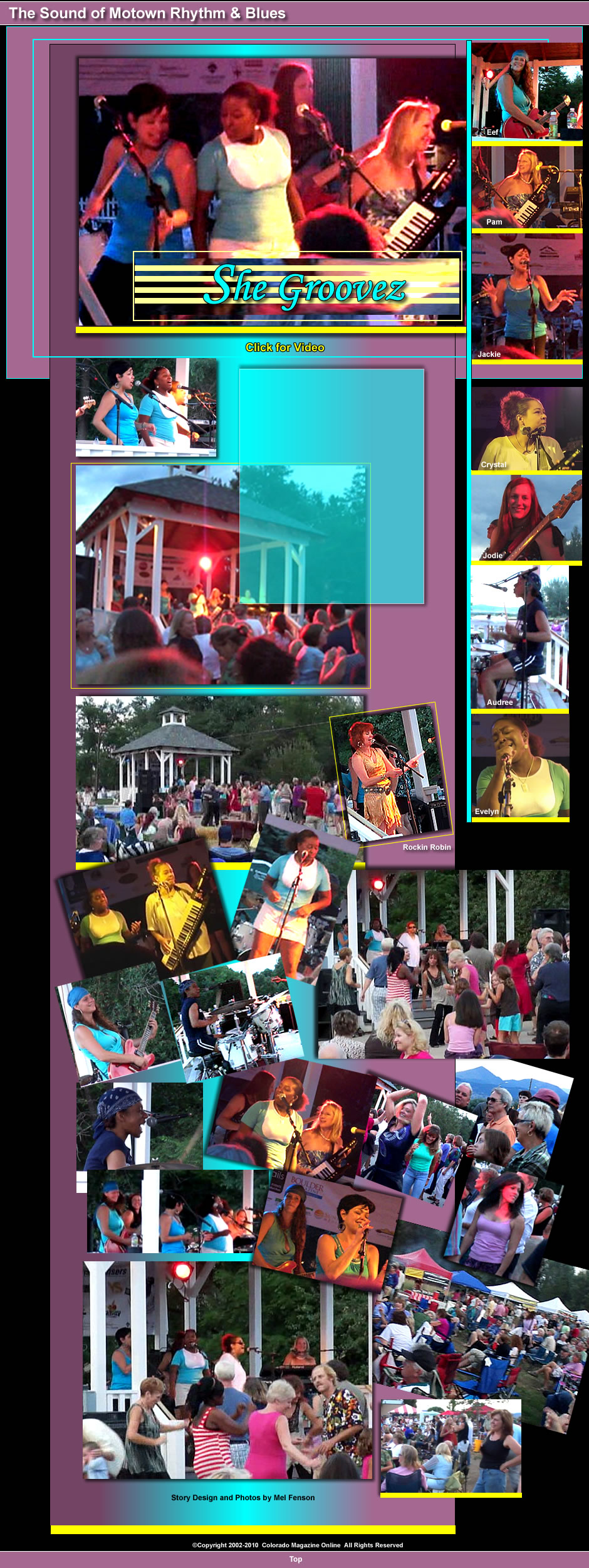 On a recent summer night in Niwot, Colorado, She Groovez, a seven-piece all-girls dance band formed in Denver in the fall of 2009, energized a crowd of a couple hundred fans at the weekly Rhythm on the Rails concert held in Niwot’s music park, alongside the railroad tracks, which parallel Colorado 119 between Boulder and Longmont.