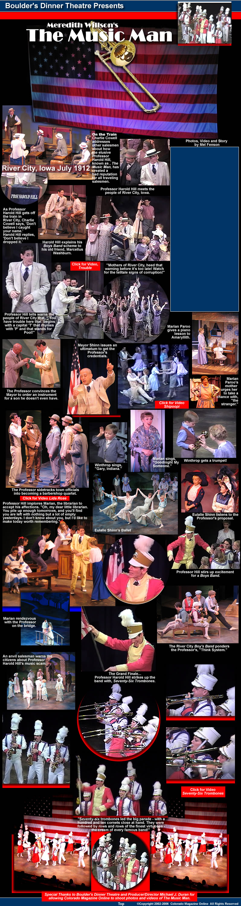 Boulder’s Dinner Theatre's lively production, which runs through Aug 19th, 2006, stars an animated Brian Norber as Professor Harold Hill, lyric sophrano, Teresa Cope as Marian Paroo, Scott Beyette as Marcellus Washburn, Wayne Kennedy as Mayor Shinn, Alicia Dunfee as Eulalie Mackecnie Shinn, and Bryce Baldwin as Winthrop. Members of the Barbershop Quartet include: John Bosick, Ryan Francoeur, Lanny Boyer, and A.K. Klimpke. Barb Reeves plays Marian’s mother, Mrs. Paroo. The show is directed and produced by Michael J. Duran. The orchestra is directed by Neal Dunfee and Chuck Koslowske.