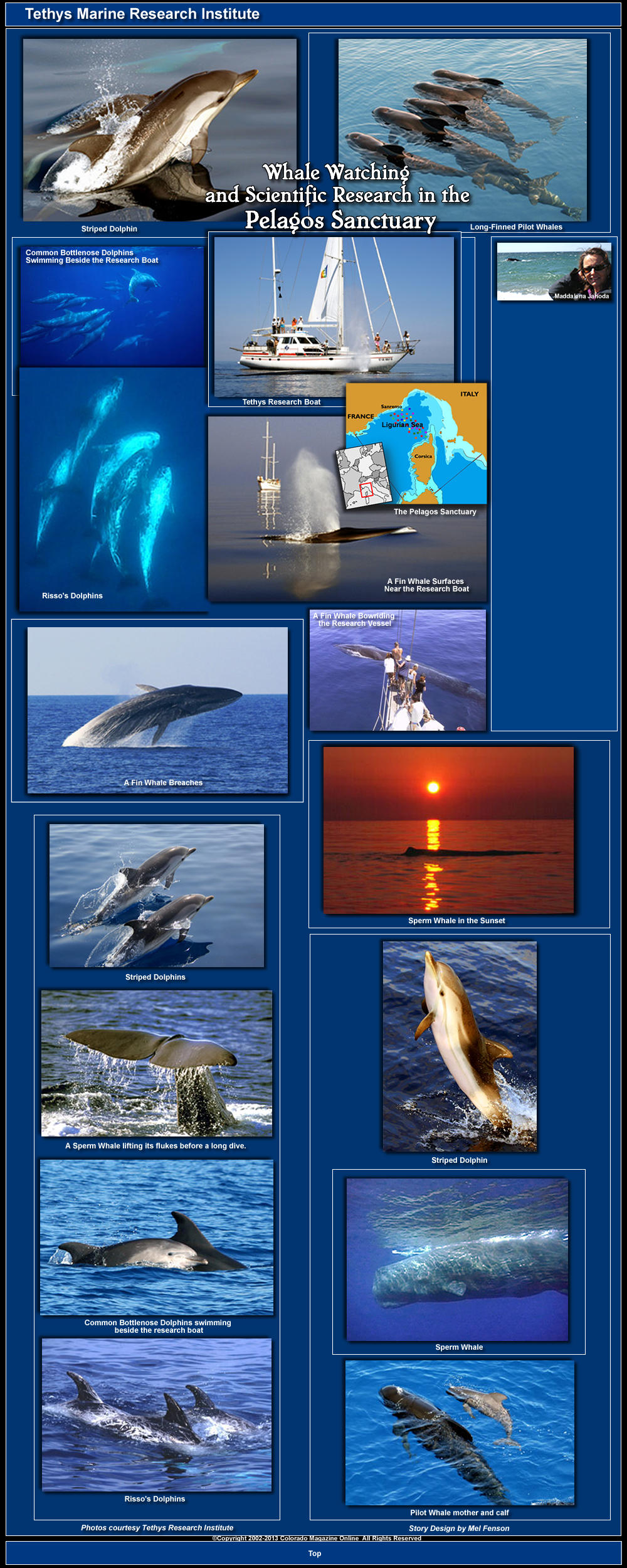 Maddalena Jahoda Although Italy is mostly renowned for its antique towns, art and history, it has now become popular among eco-tourists, who want to experience whale watching and see other marine wildlife. The Corsican-Ligurian Sea basin, to the north of Corsica, has one of the world’s highest concentrations of whales and dolphins - with as many as eight resident cetacean species. Among the varied marine life in this area, according to Tethys Research Institute's scientists, who have been studying cetaceans in this area for 27 years, are fin whales, which are the second largest species on earth. There are also sperm whales, the largest of all toothed whales, as well as pilot whales, Risso's dolphins, and striped dolphins. Valerie, an Tethys expedition participant from Germany, described her experience in seeing a fin whale as, "It was a most particular moment when a group of fin whales swam next to our boat and you could even hear them breathe. It's impossible to describe the impression that such a moment left, because it was something new, something I still have to understand." The most important area for observing marine mammals extends about 90,000 km2 in the northwestern Mediterranean Sea, between Italy, France, and the Island of Sardinia, encompassing Corsica and the Tuscany Archipelago. It has been declared a specially protected area known as the "Pelagos Sanctuary." It was the first high seas protected area in the world. In 1990, Tethys Research Institute - , a non-profit NGO founded in 1986 that is dedicated to the preservation of the marine environment and its biodiversity with a focus on cetaceans of the Mediterranean Sea - first proposed a project for the establishment of a marine biosphere reserve. The institute's studies had shown that this was the most important habitat for cetaceans in the region, given its high species diversity and its intense biological activity. In order to fund the project, Tethys offered paying volunteers the opportunity to join their expeditions at sea in order to see marine life and help researchers with their data collection. Tethys expeditions have attracted thousands of people from all over the world. Participant’s contributions over the years have represented the main funding source for the research.Today, Tethys has a core team of approximately 30 collaborators from all over the world and its professional approach to research has made it one of the leading institutes in its field. Enthusiastic people participate every year in the week long scientific expeditions in the Ligurian sea that start from the Portosole harbour in Sanremo, Italy. They are held during the long and warm mediterranean summers from May to September. As participants come from all over the world, the official language on board is English. To start an expedition, volunteers are given informal lectures by the researchers. A lot of questions are answered at the beginning of each trip. Why is it so important to protect marine mammals? Because they are are on top of the food chain and saving the whales means saving their environment as well. Which species are most likely to be spotted first? Striped dolphins, the most common species in this area that often bowride as soon as they approach the boat. And what about sperm whales? They used to be rather rare, but in the last few years they have been sighted on a regular basis. They are deep divers that spend up to one hour at a time underwater. Their vocalizations can be easily detected by means of a hydrophone. Scientist are able to follow them at a close range just by listening at their typical "clics" telling where they are heading to and when they are going to come to the surface. Each monday is rendezvous day for a new group of participants in Sanremo, the town on the Ligurian coast that is also renowned for its music festival. The group, a maximum of 11 paying volunteers plus the skipper and three to four researchers arrive on board the research boat - a confortable 21-meter motorsailer "Pelagos." There is an ice-breaking session on board with a presentation of staff members, information about safety measures, followed by a pizza dinner held in one of the nice restaurants downtown. The adventure starts on the following day. Wake up time is early - the boat leaves the harbour between 7am and 8 am. The participants and researchers are assigned sighting shifts to make sure no blow of a whale or leap of a dolphin is missed. The schedule of life on board varies, depending on various factors, such as sea state, weather conditions, and research priorities. Work with wild animals cannot be 100% predictable. Of course, a flat sea is ideal for spotting every kind of marine animal, which may also include small Mobula rays, turtles and sunfish. The first cue may be an inconspicuous one, like just a small splash. Researchers then quickly check with their binoculars - and yes, striped dolphins may come into view! In July there may be some playful juveniles among the group, or even newborns. A few miles from the harbour, still in sight of the coast, the Risso's dolphins can be sighted. They can be up to four meters long and easily identifiable by their bodies, which are naturally covered with white scars. If the sea is calm and the weather forecast is optimal, a night may even be spent at sea, drifting in a warm magical summer night. Some crews have been lucky enough to even hear a whale's blow in the night, which is an awesome experience! While passing the continental slope, where the sea bottom abruptly declines from 200 to 2000 meters, there are good chances to sight some of the most intriguing marine mammals of the Mediterranean, sperm whales. They can be recognized at a distance by their bulky boxlike heads and by their somewhat weird blow that is directed obliquely forward. Sperm whales in the Mediterranean are mostly males. They usually they stay ten minutes or so resting at the surface and breathing before starting a new dive. The