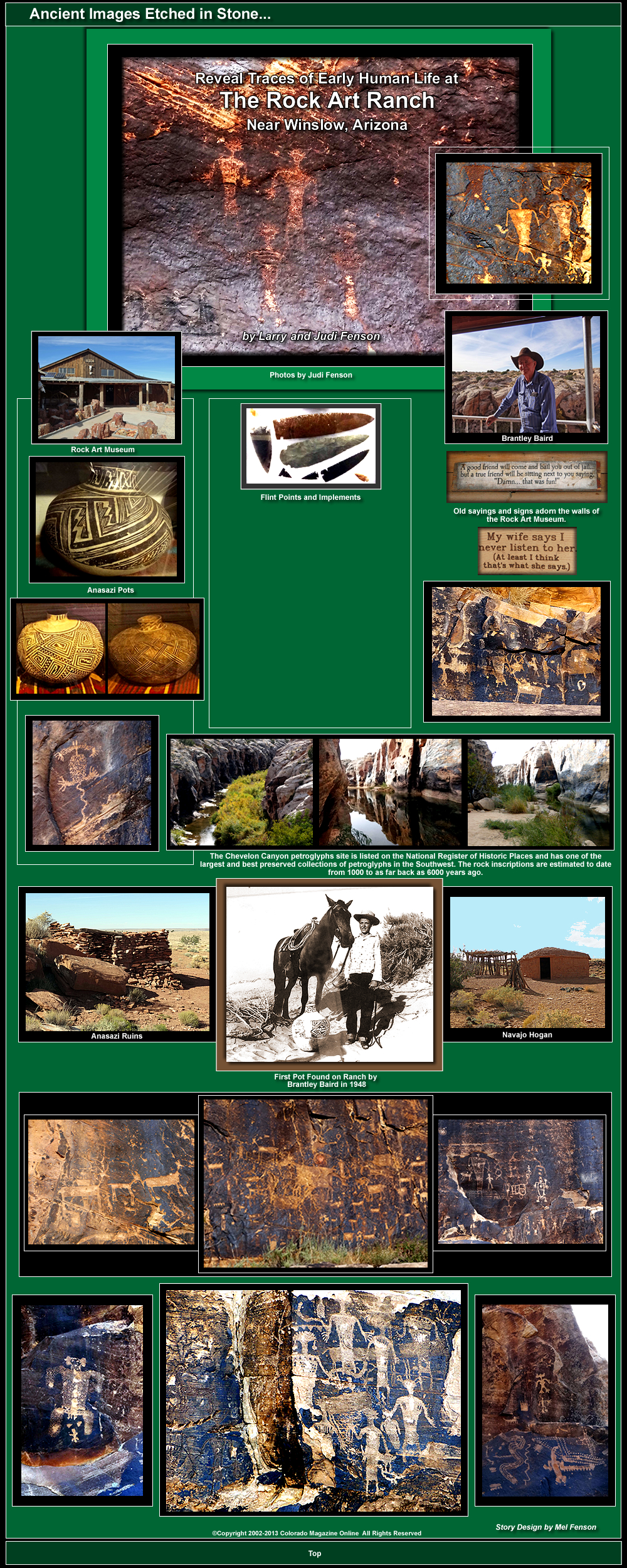 Near the house where he lives part time, he has built a large barn like structure that serves as a museum and can also accommodate groups of up to 50 for chuck wagon dinners. The place is filled with family memorabilia old signs, sayings, an authentic covered wagon and artifacts that Brantley has found on his 5000 acres over the years. After our tour of the museum, we got back in our cars and followed Brantley (in his battered pickup, of course) about 4 miles to a rise where there are several very old Native American dwellings. There is a classic Navajo hogan and a sweat house in very good condition. The age is unknown. Two elderly Navajos stopped by once and said they had lived there as children and wanted to see the place again. Some other Navajos come every few years and re-mud them. About 100 feet away is a much older Anasazi dwelling. Pottery shards litter the ground. Brantley said he has found most of the pots and other implements while on horseback after a rainstorm or a strong wind storm had exposed them. He is obviously proud of his spread and all the history it holds and is genuinely interested in it. But he realistically understands how little is really known about its past. He says he gets the most useful information not from academics who spend time there but from Native Americans. When you ask him how old a pot is or what a given implement was for, sometimes he will tell you outright (typically based on what he has learned from Native American contacts). But quite often he will say "we just don't know." A number of Arizona universities have sponsored digs and field training on the ranch, focusing on ruins scattered throughout the property as well as on the petroglyphs in Chevelon Canyon. In 2011, a contingent of professors and students from the anthropology department at the University of Arizona discovered 15 sites on the ranch, some dating back 5000 years. The team carried out excavations at two small pueblos, revealing rooms with stone masonry dating back 800 years. Further work was done this year. Next we got back in our cars and continued a couple miles further to the edge of a really beautiful river canyon. You would never expect it to be there as the surrounding terrain is so flat. Brantley has constructed an overlook and a series of maybe 30 metal steps and walkways with railings that takes you about 60 feet down to the base of the canyon. The Chevelon Canyon petroglyphs site is listed on the National Register of Historic Places and a number of experts have described it as one of the largest and best preserved collections of petroglyphs in the Southwest. The rock inscriptions are estimated to date from 1000 to as far back as 6000 years ago. The canyon is very steep, narrow