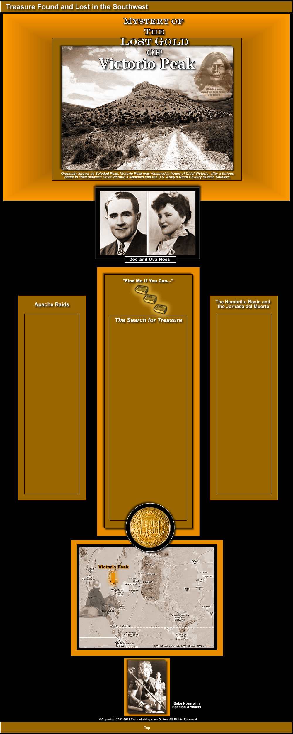 way nearly sixty feet down the narrow passageway into the mountain. As he continued to explore the side caverns, Doc claimed he found a hoard of treasure including coins, jewels, saddles and priceless artifacts, including a gold statue of the Virgin Mary and some old letters - the most recent was dated 1880. This treasure was only the beginning. In a deeper cavern, Doc found what he thought was a stack of worthless black iron bars. He estimated there were thousands of these bars stacked against a wall, each he estimated, probably weighed over forty pounds. Doc filled his pockets with gold coins, grabbed a couple of jeweled swords, and laboriously climbed back up the rope to Babe, who was waiting anxiously at the surface. After telling her what he had discovered and showing her what he had brought to the surface, she insisted that he go back into the mine for one of the iron bars. He once again climbed down into the forbidding darkness of the caverns and after much searching, finally found a small iron bar that was light enough to carry back through the narrow passageway. When he reached the surface, he told Babe, "This is the last one of them babies I'm gonna bring out." When Babe rolled the bar over, she saw a yellow gleam where the gravel of the hillside had scratched off centuries of black grime. To the Noses surprise, what looked like a piece of iron turned out to be a solid gold bar! Later, the value of the gold he had discovered in the cave was estimated to be worth more than two billion dollars. After the discovery of the treasure, Doc and Babe spent every free moment exploring the tunnels inside the mountain, while living in a tent at the base of the peak. On each trip, Doc would retrieve two gold bars and as many artifacts as he could carry. At one time, as legend has it, he brought out a crown, which contained two hundred forty-three diamonds and one pigeon-blood ruby. Since Doc trusted no one, not even his wife Babe, he would disappear into the desert to hide pieces of the treasure in places that he never revealed to anyone. Among the artifacts Doc said he retrieved, were some documents dated 1797, which he buried in the desert in a Wells Fargo chest from the caverns, along with various other treasures. Although the originals have never been recovered, it has been reported that a copy of one of the documents proved to be a translation from Pope Pius III. Doc Noss cared little about the historical value of the treasures inside Victorio Peak. He mostly ignored the pouches, packs and artifacts scattered about, while he focused his attention on the gold coins and bars he found. Unfortunately, Doc was unable to profit from the gold bars, because ironically, four years before his discovery, Congress had passed the Gold Act, which outlawed the private ownership of gold. Even though he was unable to sell the gold bars on the open market, Noss continued to work steadily at removing the treasure, hoping to sell it on the black market. In the spring of 1938, Doc Noss and Babe went to Santa Fe to establish legal ownership of his find. He filed a lease with the State of New Mexico for the entire section of land surrounding Victorio Peak. He also filed several mining claims on and around Victorio Peak, as well as a treasure trove claim. With legal ownership established, Noss began to openly work his claim, but he also became increasingly paranoid, continuing to hide his gold bars all over the desert. When Doc's story eventually hit the headlines, there was much speculation about the source of the treasure stashed inside Victorio Peak. Did some of the treasure trace back to loot the Apaches had hidden, after their raids on travelers in the Jornada del Muerto? Was it gold stolen from the Aztecs by the Spaniards? In the Socorro-Hot Springs-Hatch area near White Sands and Victorio Peak, there is a local legend about the Casa del Cueva de Oro, or the “House of the Golden Cave.” Could this Golden Cave have been the gold mine in Victorio Peak? Some believe it was. Others believe that Noss found the treasure of Don Juan de Oñate y Salazar (1550 – 1626), who founded New Mexico as a Spanish colony in 1598 and became its first colonial governor. During his rule, he reportedly amassed a treasure of gold, silver and jewels, before being ordered back to Mexico City in 1607. There is also speculation that the treasure could be the missing wealth of Emperor Maxmillian, who was Mexico's emperor in the 1860's. When Maxmillian heard of a plot to assassinate him, he began to move his gold and treasures out of Mexico. According to legend, he sent a palace full of valuables to the United States to be hidden. Maxmillian was assassinated in 1867. Some researchers theorized that the shaft could be the one mined by a Catholic missionary named Felipe La Rue, in the late 1800's, then used again later by Chief Victorio to store his plunder. Padre La Rue, a native of France, was among the small group of priests who volunteered for service in Mexico. His party sailed to Florida, crossed the Gulf of Mexico to Vera Cruz, and from there, traveled to Mexico City by ox cart. From there they traveled north to the city of Chihuahua, which they reached in 1798. At the Padre’s new station in a large hacienda, he began his missionary work among the local Indians and Mexicans. While there, he heard stories about a fabulous source of rich minerals in the mountains further to the north. Among his parishioners was an old man, who had been an explorer and soldier of fortune, during his youth, and had traveled widely over the country that lay to the north. Padre La Rue personally cared for the ailing old man and the two became good friends. One day, Padre La Rue asked him about the riches he had heard about. The old man told the priest he knew about a rich deposit of gold located high in the mountains about two days travel north of El Paso del Norte - the present-day site of El Paso, Texas. Padre La Rue retraced a route to the 