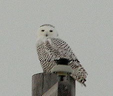 We head down a different road in search of snowy owls and caribou. Lemmings (small rodents) are present in this vicinity and they attract the owls. At 12:30, a rather bright sun appears -- for about 10 minutes -- and that was it for the day. Minutes later, light snow begins to fall. Then we get lucky, spotting a beautiful young female snowy owl perched on an electrical pole.