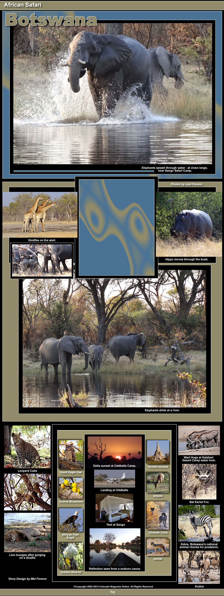 by Larry and Judi Fenson Botswana always gets top ratings among the 10 or so countries in Africa known for wildlife viewing. A number of factors contribute to Botswana's high rank as a safari destination. Most important is the presence of the Okavango Delta, a vast and pristine watery expanse of rivers, flood plains and islands. The Delta is located, oddly enough, in the middle of the Kalahari Desert. But water flowing from the highlands of Angola some 900 miles away arrives each year in June-July, at the beginning of the dry season, annually restoring these life-sustaining wetlands. The watery environment acts as a magnet to Kalahari wildlife, making the Okavango one of the richest game-viewing destinations in the world. Another positive for Botswana is the remoteness of the lodges. Most are situated in or adjacent to game parks reachable only by light aircraft. Your lodging puts you in such close proximity to wildlife that, at most camps, staff escorts are required between your quarters and the main lodge area after dark. At two of our 3 lodges, we could hear hippos at night no more than 10 feet from our tents. At one camp, two elephants made themselves at home one night, doing a bit of damage. It was quite interesting to observe and a bit scary. At our Kalahari lodge, two male lions were fighting on the grounds early in the morning the day before we arrived. That would have been something to see. We heard the eerie yipping of jackals at that lodge late evenings and early mornings. Sango Safari Camp One day we learned that two male lions had been spotted with a giraffe kill. We weren't enthusiastic about seeing the dead giraffe but we did want to see some lions in Botswana. So off we went. Even at some distance away, we saw a sizable group of vultures circling overhead. When we reached the spot, one of the lions was prostate next to the giraffe, so stuffed he seemed hardly able to move. We approached in our vehicle to no more than 10 or 12 feet away. It is not often you can get that close to a lion. We had more good luck on another day when our guide Joel received word that two leopard cubs had been spotted. We moved in and were excited to get very good views of the two cubs playing. Joel estimated that they were about 9 months old, already pretty large - and gorgeous! At each of the lodges, excursions take place early in the morning from about 7 am to 10:30 or 11:00 and then again in the late afternoon from about 3:30 to 6:30.These are the best times to see animals and birds and it is also coolest during these hours. Other than lunch and then tea around 3:00, you have free time during the mid-day hours. The lodges always have comfortable lounge areas and a nice range of nature books and field guides. Coffee and tea and soft drinks are typically available at all times. Many lodges have decks or viewing platforms and some have watering holes which are great for watching the interplay as animals cautiously approach and retreat. Oddballs We had an unexpected adventure our last night at Oddballs when two elephants made themselves at home in our camp around 3:00 am. They were after palm nuts. It happened that a tall palm across from our tent was loaded with them. When our visitor shook the palm vigorously, the large pods came tumbling down on top of the wooden cover over the tent (now we know why the covers are there). This event made a huge clatter, waking almost everyone in camp. Judi shot up in bed saying "ellies!" After a while, this elephant ambled across the path to our friends' tent adjacent to ours to munch on a jackleberry busy and was virtually eyeball to eyeball with them peering out through their mesh window. But not to worry, Mr. Elephant strolled back toward the lounge after a while and then across the walkway that leads to the airstrip, crunching a few boards and rails before paying a visit to Delta Camp about 20 minutes away. Kalahari Desert Camp