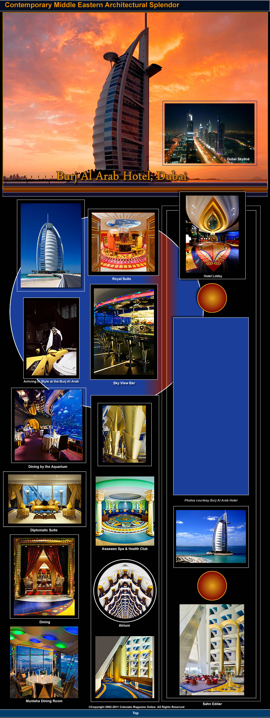 Unrivalled personalized service is a signature of Burj Al Arab. The hotel has over 1,600 employees from 75 countries. For the comfort and convenience of guests - discreet in-suite check-in is conducted in the privacy of an individual suite - if you don’t care to be noticed, a private reception desk is available on every floor, and a brigade of highly trained butlers is in attendance 24 hours a day to provide the ultimate in personal service for visitors. You won’t find anything to match this style in Kansas. If all these amenities are still inadequate to meet your needs, you may obtain a chauffeur driven Rolls Royce for transportation to the airport or around Dubai - and who would want to do without this nice touch of convenience. Exclusive helicopter transportion to and from Dubai International Airport can also be arranged. The hotel has a helipad cantilevered off the sail, near the top floor of the hotel. All-in-all, the shimmering opulence and service of the Burj Al Arab offers the ultimate in Arabian hospitality.
