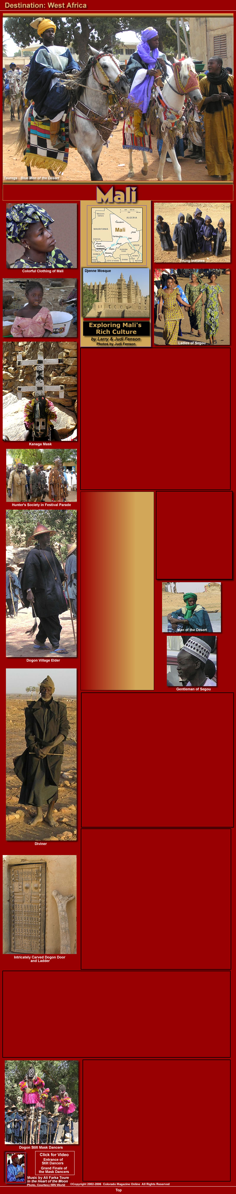 In early February 2006, we spent 10 days in the West African country of Mali. Every day was interesting and some of the sights were the equal of those we have seen anywhere. Until the point in time that Mali first attracted our attention, we knew as little about it and about West Africa as most Americans, i.e., practically nothing. For this reason, when telling friends about our plans, we said we were going to the West African country of Mali. This provided at least a vague point of reference.
