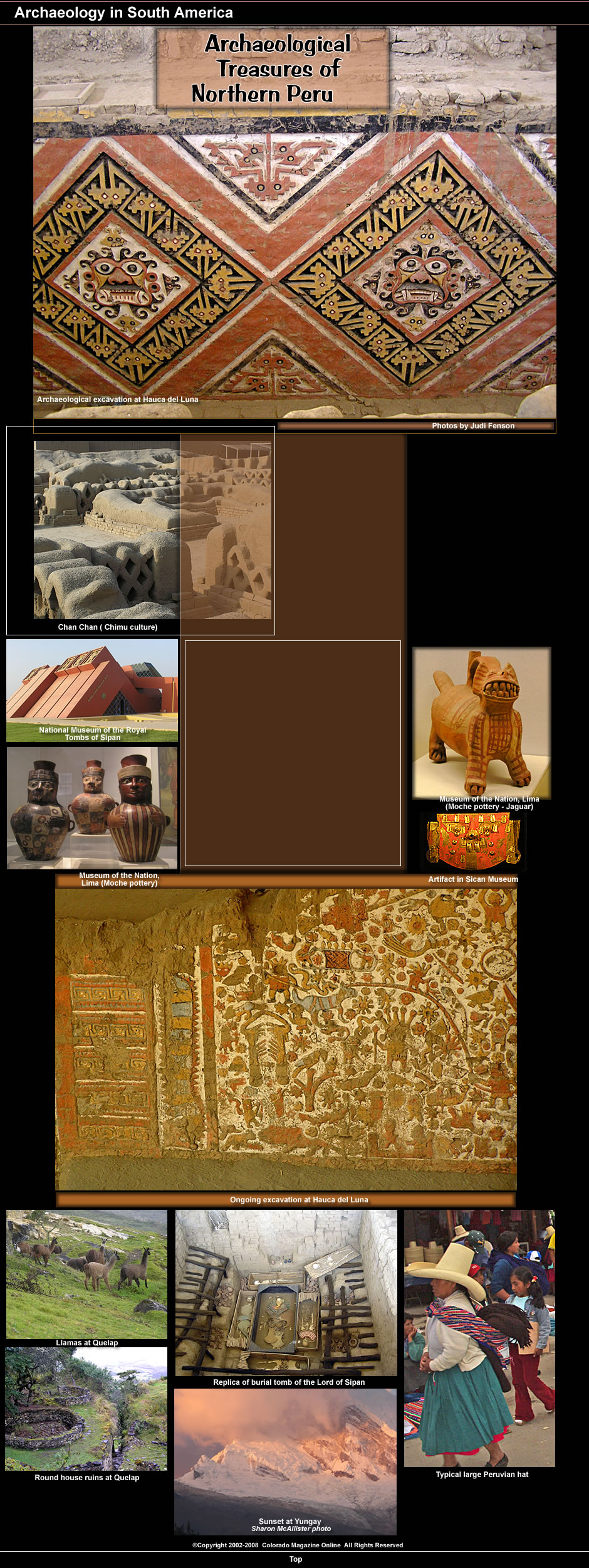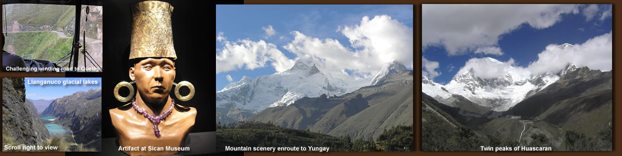 Our multifaceted trip centered around the ancient cultures of Northern Peru, combining archeology with some of the best Andean scenery in South America. We visited many of the most significant pre-Inca ruins (including three UNESCO World Heritage sites) along with some impressive museums that hold their most important artifacts. To reach these sites, we crossed truly spectacular mountain passes, traversing some genuinely harrowing roads. Our 2-week itinerary was planned and conducted by Ric Finch, owner of Rutahsa Tours, with a group of 16, in May 2006. Ric provides a detailed itinerary of the trip on his website http://www.rutahsa.com/peru-06-n.html..