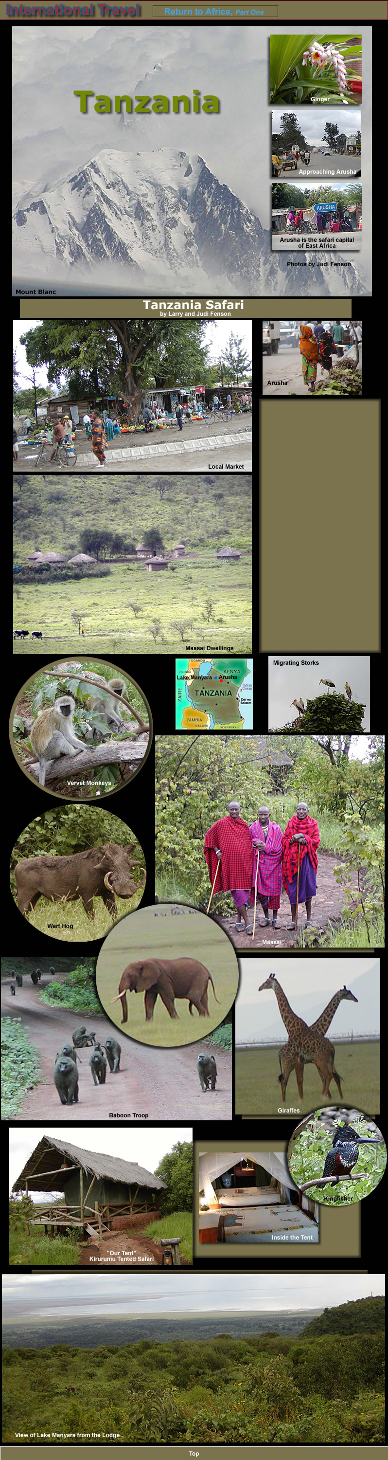 May 2003 We eventually cleared customs and found our 2Afrika representative who transported us to the Ilboru Safari Lodge, a 45 minute drive from the airport for some much-needed rest. The following morning we got a better look at the tropical grounds, resident birds, and the brick, ivy-covered Ilboru Lodge cottages, each with a conical thatched roof. We were exhilarated to be in Africa again (our second visit) and we were eager to get on to our first game park. Our driver/guide for the next six days was Shabba, an affable and knowledgeable resident of a nearby village. Our photo safari will be presented in installments in the next several issues of the magazine. We begin with Lake Manyara. We drove back through Arusha enroute to our first game park. As is true of towns in many third world regions, the core area is pretty shabby. The fringes of the town were more village-like and more distinctly African. These areas teem with people, push carts, bikes, wagons, trucks, and vans criss-crossing everywhere among small markets and shops. The setting was further enlivened by the ultra-colorful clothing worn by the local women. There are great scenes to capture at every turn, but you are reluctant to do so unless your picture can be taken discretely. You see people selling gasoline in bottles and carrying all manner of items on their heads and in huge sacks and baskets. As we entered into the green grasslands, we began to see the semi-nomadic Maasai in their highly distinctive red robes, and occasional picturesque thatched dwellings. We kept searching for majestic Mt. Kilimanjaro without success. It is habitually enshrouded in clouds. Within an hour beyond Arusha, the road was virtually deserted. We caught sight of some giraffes and then some ostriches. As we approached Shabba's village, we encountered one of the most amazing scenes of the entire trip. Trees lined each side of the road for a distance of perhaps a third of a mile. In the trees were many hundreds of migrating storks. We stayed here for 30 minutes, fascinated, watching these huge birds take off and glide back to their nests. It was just one of those indescribable scenes. We entered Lake Manyara National Park late morning. This park is very lush and dense with red dirt roads and numerous streams, quite different from the Serengeti plain we had seen on an earlier trip to Kenya. We seemed to have close encounters with game at every turn in this park - vervet monkeys, hornbills, storks, impalas, giraffes, water buffalo, baboons, pelicans, ibis, herons, and kingfishers. We stopped at the lake where there were thousands of flamingoes, another unbelievable scene. All of this within our first hour in the park and not a single other vehicle in sight since passing through the gates. At one point, Shabba called our attention to a group of tsetse flies making themselves at home in our vehicle. The four us of eyed them warily, mindful of the stories we had all heard about these dreaded pests. During the 6 hours we spent in the park we also saw elephants, zebras, dik diks, several types of eagles and numerous other bird species, including the absolutely gorgeous green and yellow bee eater. We were surprised to learn that there are more than 500 bird species in Tanzania, almost as many as in the renowned bird watching regions of Central and South America. Moreover, in jungle areas you hear a lot of birds but it is difficult to see them as they are often high in the dense jungle canopy. In the game parks of Tanzania and Kenya, however, birds are often out in the open as there are relatively few trees. About 5:00 pm, we arrived at Kirurumu Luxury Tented Lodge. What a neat place! The tented units spread across a terraced slope overlooking Lake Manyara. Pathways between the tents and the open-air dining pavilion were landscaped with native plants, shrubs and trees. The tents did not require us to rough it. They were complete with verandas and full en suite facilities - as close as we're likely to come to an "Out of Africa" experience. Judi relished sitting on the veranda, sipping a glass of wine, and watching the sun set. While dinning, attendants spray your quarters with mosquito repellant and arrange the mosquito netting around your bed. Dinner was avocado and tomato salad, cream of onion soup, tilapia with potatoes and vegetables, and fresh fruit. A lightning storm moved through at bedtime and knocked out the lights, but who needs lights in a tent anyway. ...