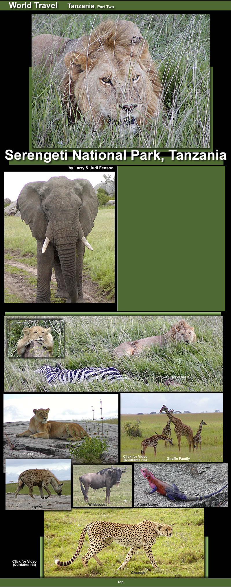 Photographed by Judi Fenson Serengeti National Park is probably the best-known wildlife sanctuary in the world. With more than two-million wildebeest, half-million Thomson's gazelle, and a quarter-of-a-million zebra, it has the greatest concentration of plains game in Africa. The name Serengeti, derived from the Maasai language, means, "an extended place." The Serengeti National Park comprises an area of 12,950 square kilometers. The park lies between the shores of Lake Victoria in the west, Lake Eyasi in the south, and the Great Rift Valley to the east. It represents the most complex natural ecosystem on earth. The Serengeti's climate is normally warm and dry with its main rainy season occurring from March to May. The Serengeti supports impressive populations of more than 30 species of large harbivores and nearly 500 species of birds. Its landscape varies from open grass plains in the south to savannah with scattered acacia trees in the center, and hilly, wooded grassland in the north with extensive woodland and black clay plains in the west. Small rivers, lakes and swamps are found scattered throughout the park. Rising in the southeast are great volcanic massifs and craters of the Ngorongoro Highlands. Each area has a unique environment and its own wildlife species. For Travel Information,