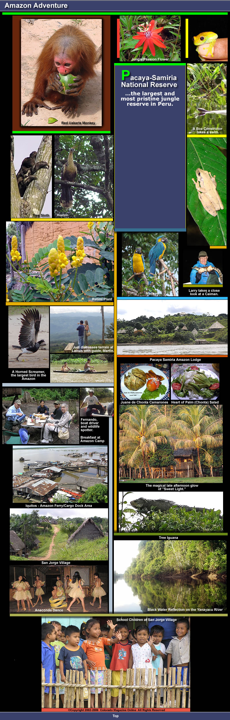 the countryside. That evening we fly to Lima and begin the long international check-in process. This is one airport where the 3-hour check in for international flights is really needed. Reservations at the Pacaya-Samiria Amazon Lodge can be booked in the US through World Class Travel Services (www.peruperu.com) or on the lodge website www.pacayasamiria.com.pe. |